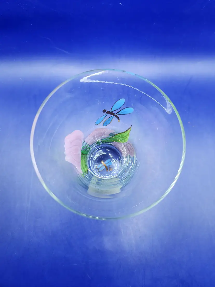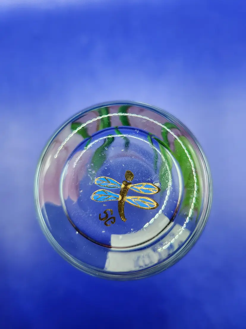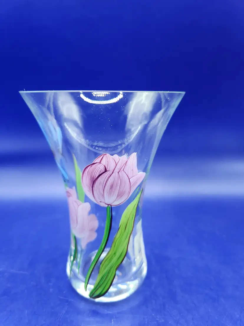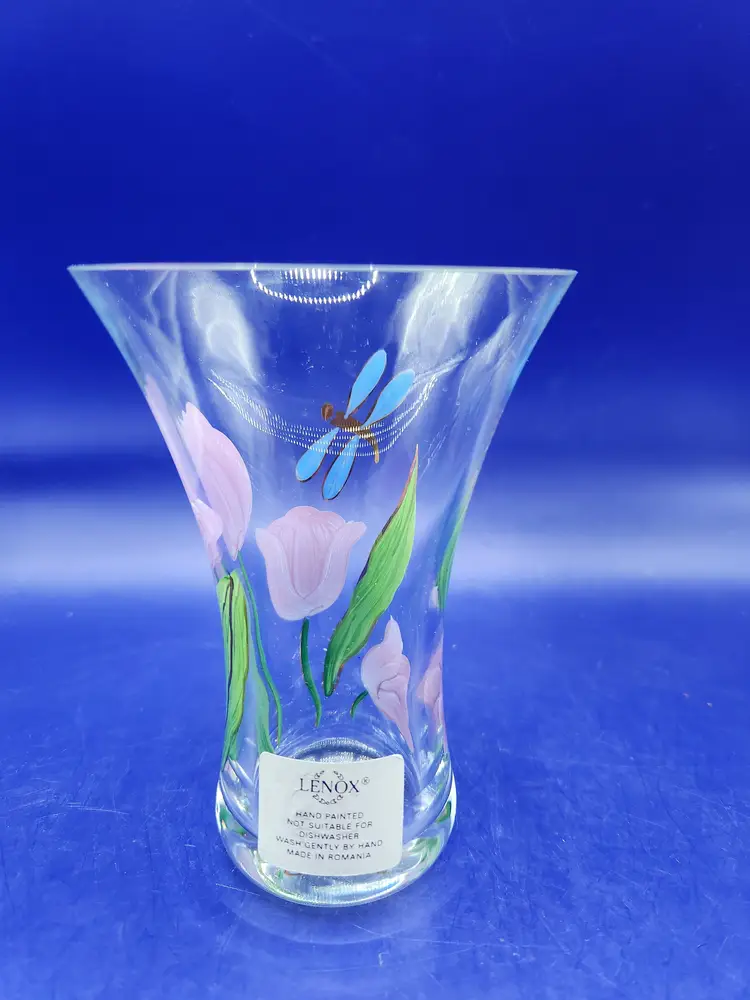 Lenox Tulip and Dragonfly Glass Vase Hand painted Made in Romania Signed by artist (SE or SC) Measures 5 inches tall, bottom is 2 inches wide graduating to 3 1/2 inches at the top No chips or cracks