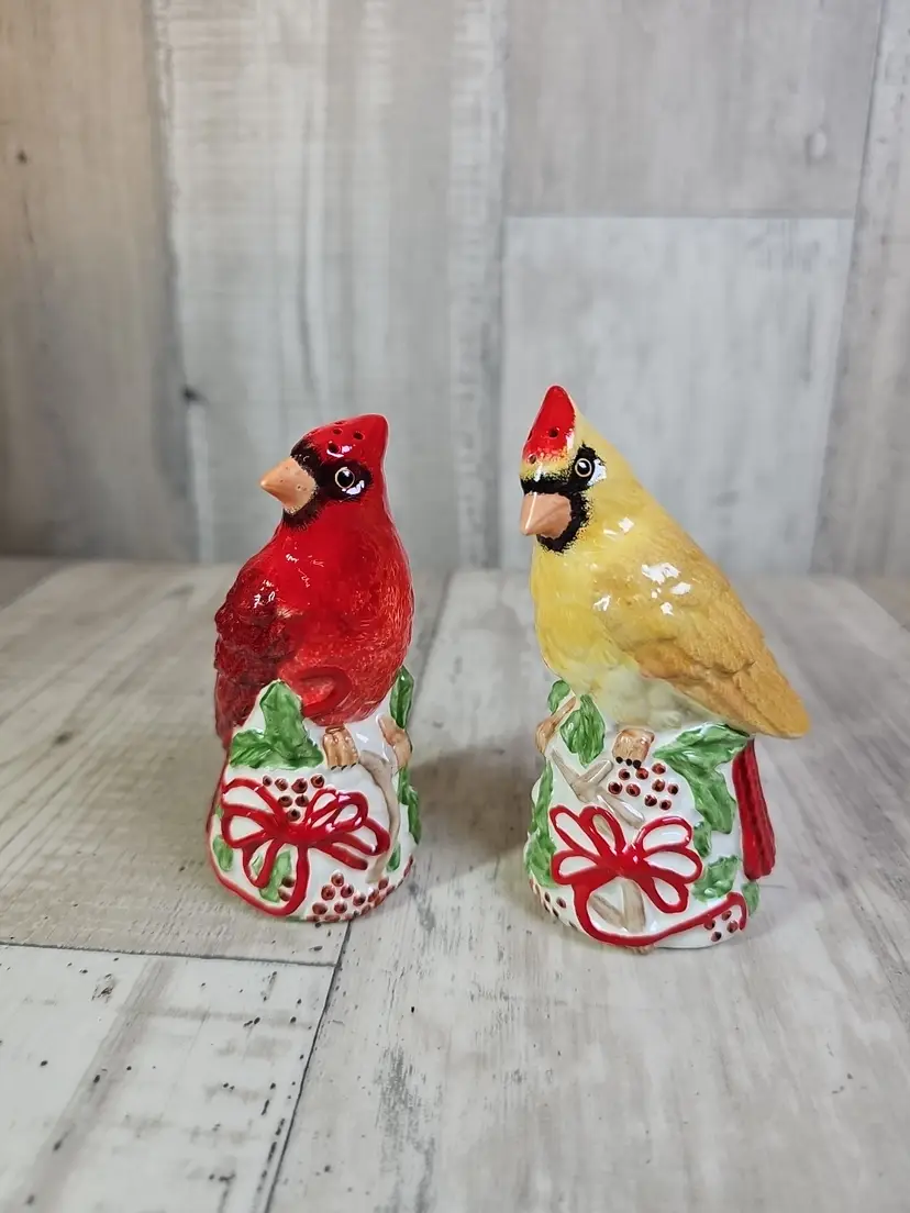 Description: Elegant Lenox Winter Greetings figural salt and pepper shaker set featuring male and female cardinals with festive holly and ribbon details. Perfect for holiday dining or collectors of Lenox bird-themed decor.