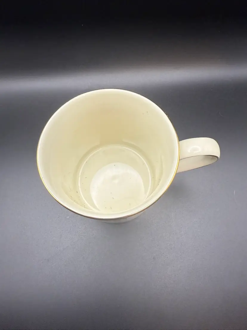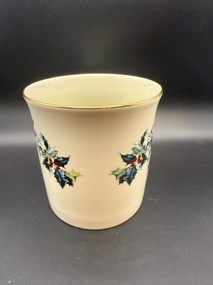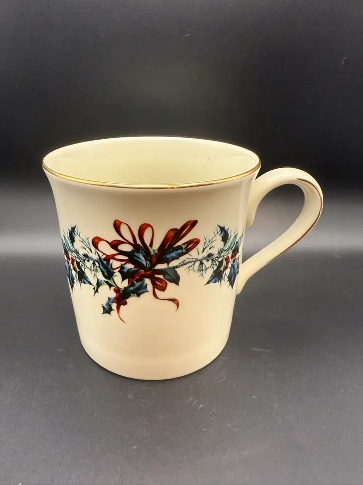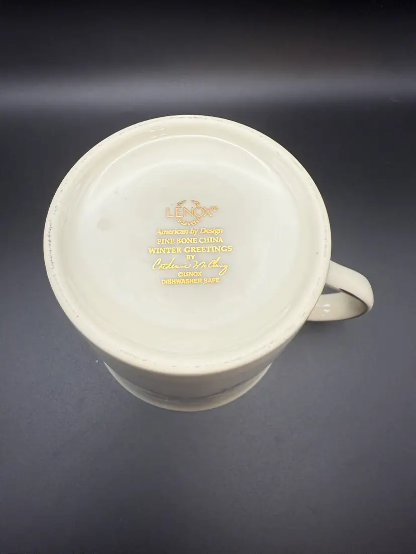 This is part of the Winter Greetings Collection, known for its holiday-themed motif featuring winter birds, pinecones, holly, and mistletoe. The mug is crafted from durable ivory bone china and features 24 karat gold accents.