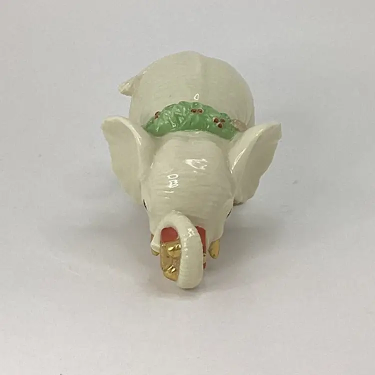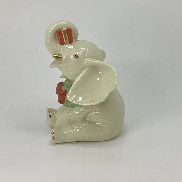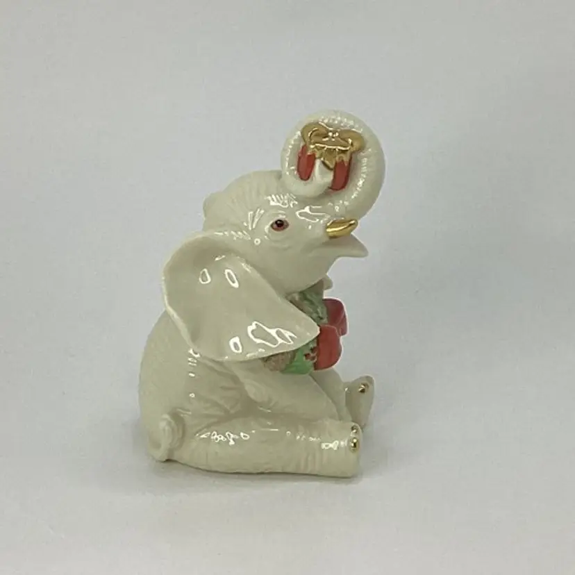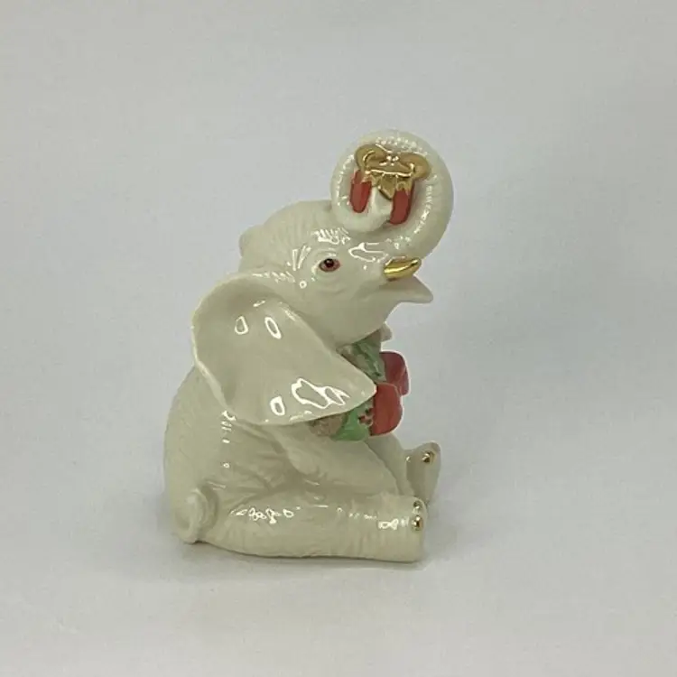 This Lenox Yuletide Christmas figurine features a charming little elephant holding a festive package wearing a wreath, perfect for holiday gift-giving. Approx. Dimensions: L = 3.25 in W = 3 in H = 4 in