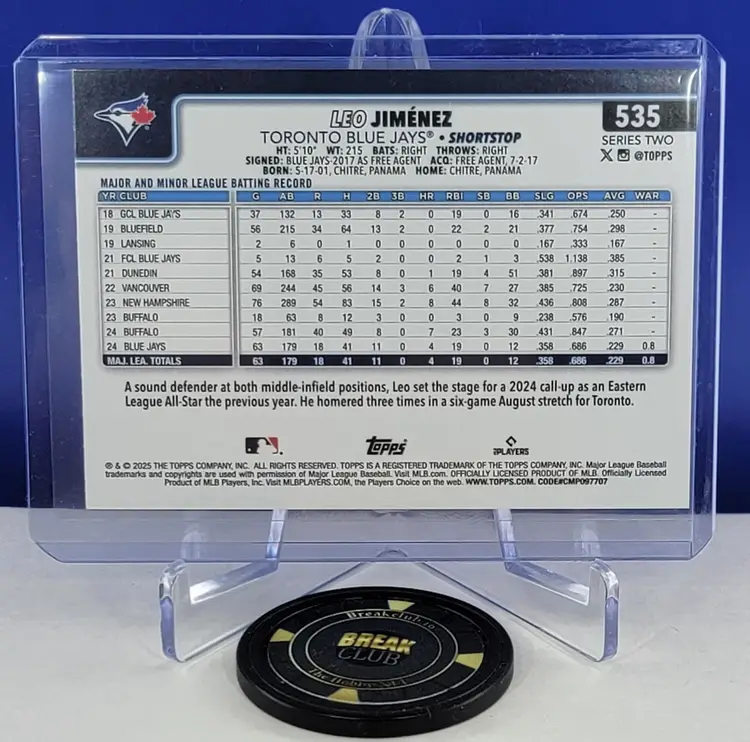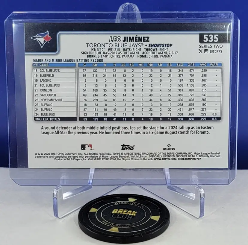 Leo Jimenez 2025 Topps Seies 2 Team Color Border Variation Toronto Blue Jays (1:229 Hobby packs)