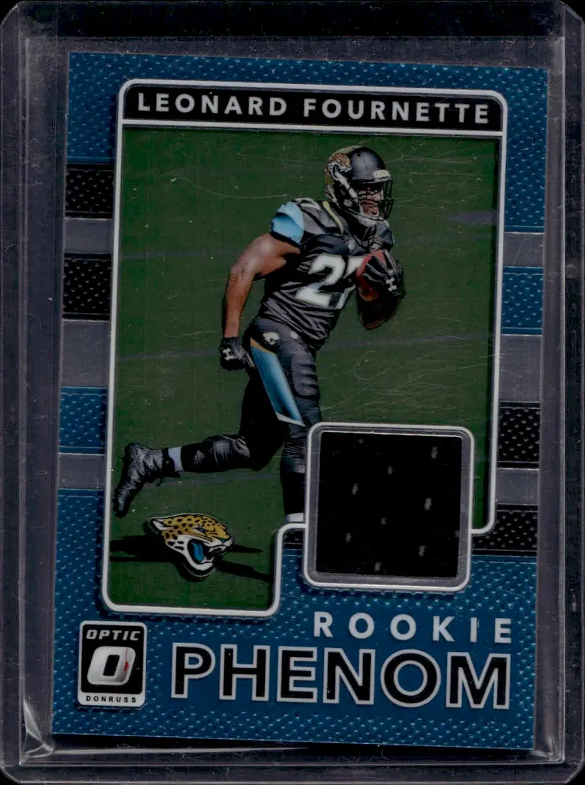 Add this Leonard Fournette Rookie Phenom card from the Donruss Optic series to your collection. A great find for Jacksonville Jaguars fans and card enthusiasts.