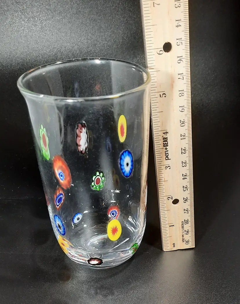 This hand-blown tumbler is a Leonardo Murano design. It is clear glass with randomly placed multi-color Millefiori canes. It stands approximately 5 1/2 inches tall and 3 inches in diameter. It is in excellent pre-owned condition. This tumbler is not crooked, it is perfectly straight. The picture is crooked.