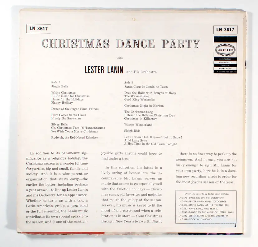 Christmas Dance Party, by Lester Lanin, is an upbeat big-band album that reimagines classic Christmas carols as lively dance medleys designed for continuous ballroom dancing. The 13-track record features swinging arrangements of standards like Jingle Bells, White Christmas (medleyed with I'll Be Home for Christmas, Home for the Holidays, and Happy Holiday), Rudolph the Red-Nosed Reindeer, Sleigh Ride, and Winter Wonderland, infused with 1950s guitar riffs and a relentless cheerful tempo. Historically significant as one of Lanin's many Billboard-charting albums during his peak, it reflects his role as the premier society bandleader who performed at White House inaugural balls from Eisenhower to Carter and elite events worldwide, embodying the "happiness business" of high-society escapism. Often hailed as one of the most joyful and swinging Christmas albums ever, it has become a multi-generational holiday staple for families, with fans playing it annually for over 50 years. The album produced no hit singles, as it consists entirely of instrumental medleys without vocal tracks intended for charting.