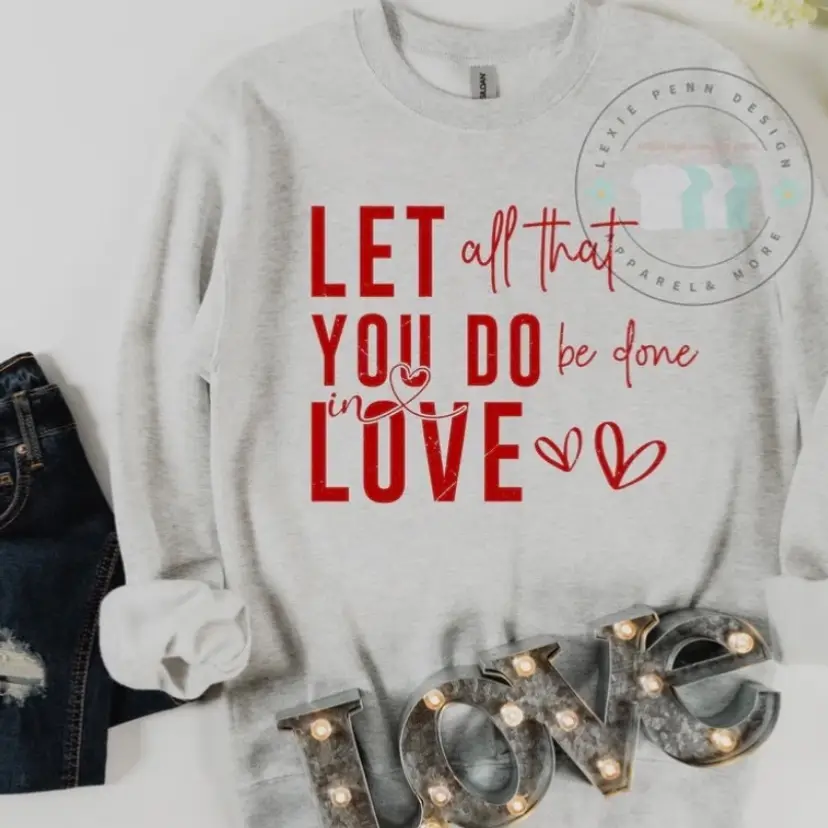 Let all you do be done with love crewneck sweatshirt in light gray Medium weight Unisex fit Soft interior Size up if you like a looser fit