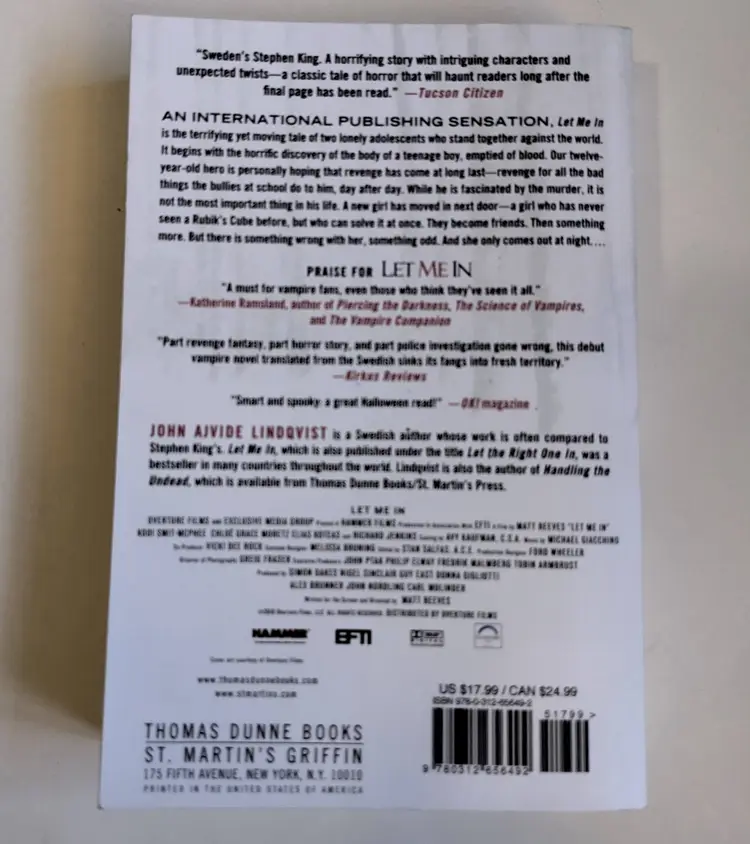 AN INTERNATIONAL PUBLISHING SENSATION Let Me In is the terrifying yet moving tale of two lonely adolescents who stand together against the world. It begins with the horrific discovery of the body of a teenage boy, emptied of blood. Our twelve-year-old hero is personally hoping that revenge has come at long last—revenge for all the bad things the bullies at school do to him, day after day, while he is fascinated by the murder, it is not the most important thing in his life. A new girl has moved in next door—a girl who has never seen a Rubik’s Cube before, but who can solve it at once. They become friends. Then something more. But there is something wrong with her, something odd. And she only comes out at night...