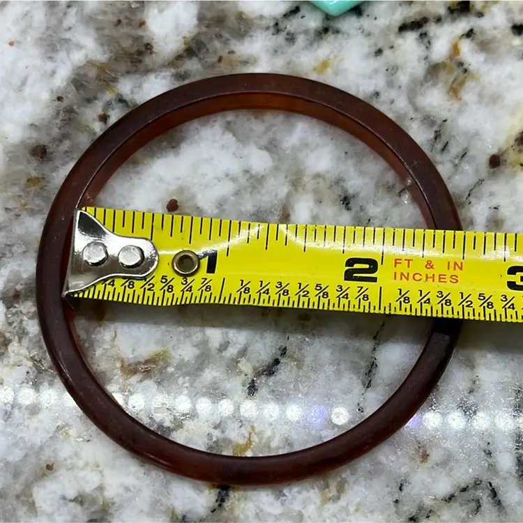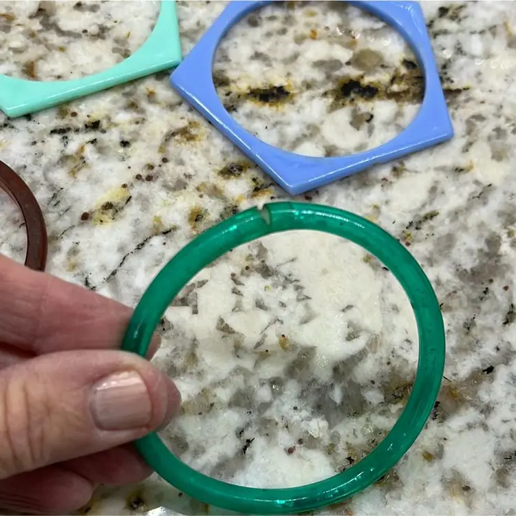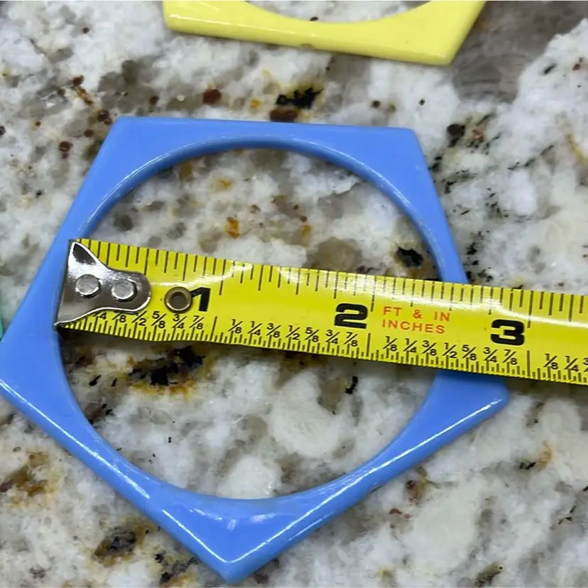 Set of 6 Vintage Bangle Bracelets, 4 with unique shapes. The other two round ones brown (Bakelite or plastic), green (plastic w/small slit in side) Openings are approximately 2 3/8” - 2 1/2”