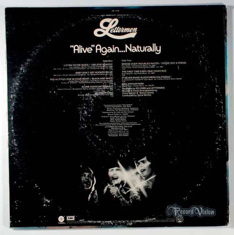 "Alive" Again Naturally, by Lettermen, is a live recording capturing the group's signature close-harmony pop sound during a performance lasting over two hours, edited to fit the vinyl format. Produced by Ed Cobb, the album features a mix of contemporary covers and original tracks, reflecting the trio’s effort to appeal to younger audiences by dropping "The" from their name during this period. While the album itself did not chart significantly, it includes a cover of Gilbert O'Sullivan’s Alone Again (Naturally), a melancholic ballad that was a major hit in 1972, reaching No. 1 on the Billboard Hot 100 for six non-consecutive weeks. The Lettermen’s rendition of this song did not achieve the same commercial success, but the album remains a notable snapshot of their live performance prowess and adaptability in the early 1970s. Historically, the album reflects the group’s transition through changing musical trends while maintaining their romantic, harmonic style.