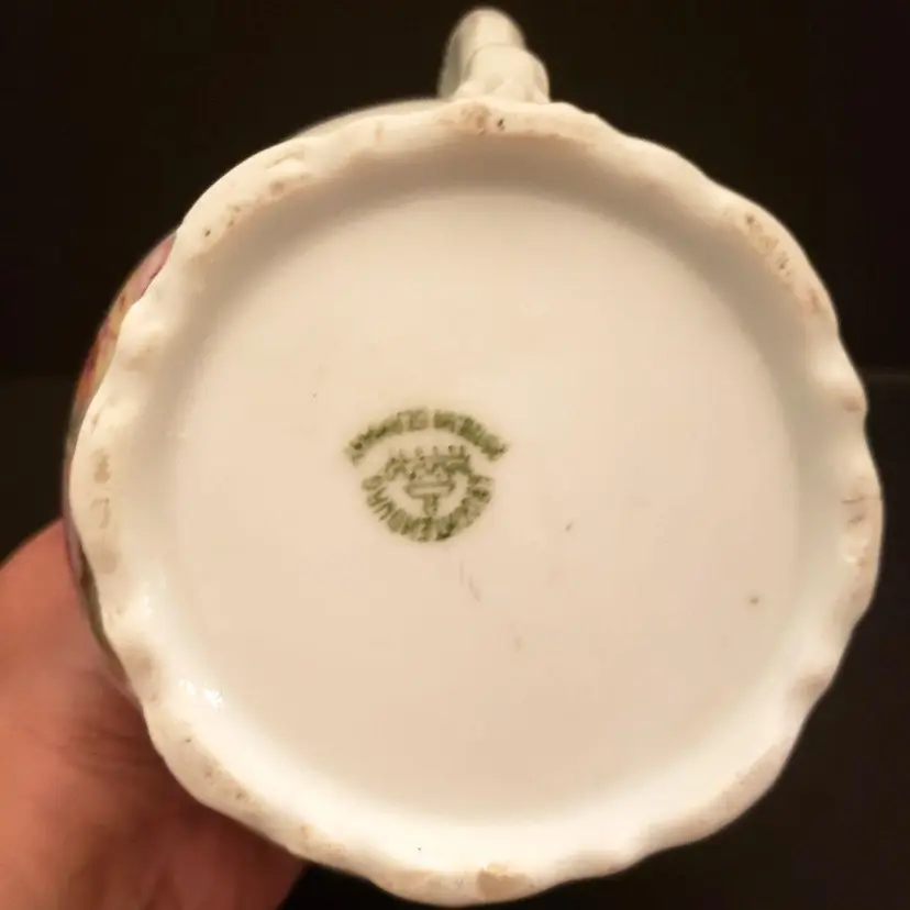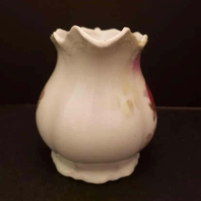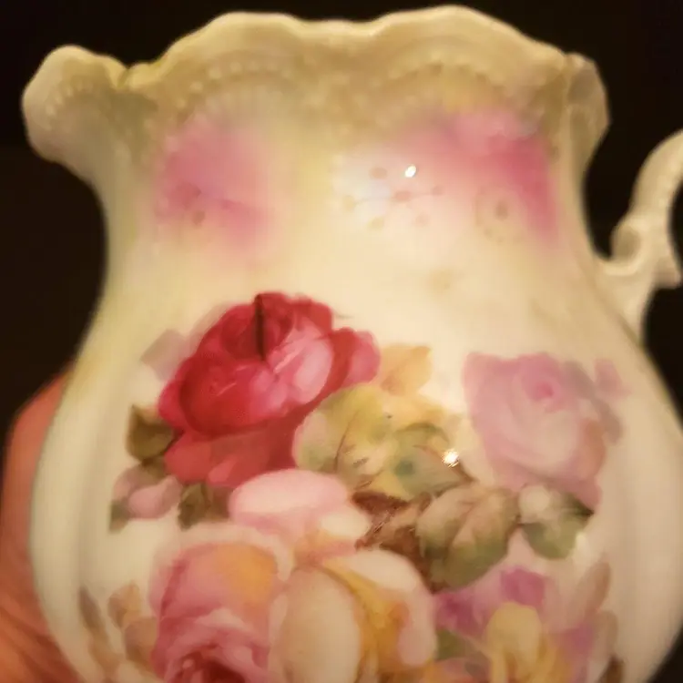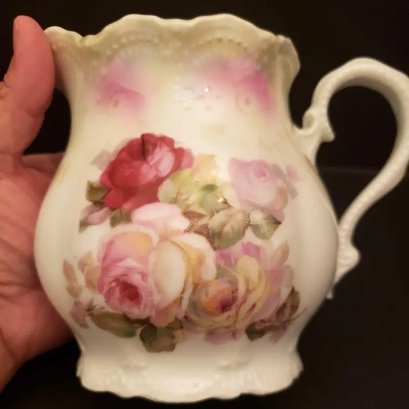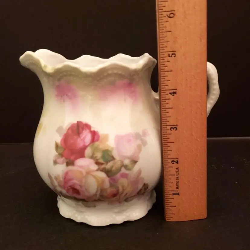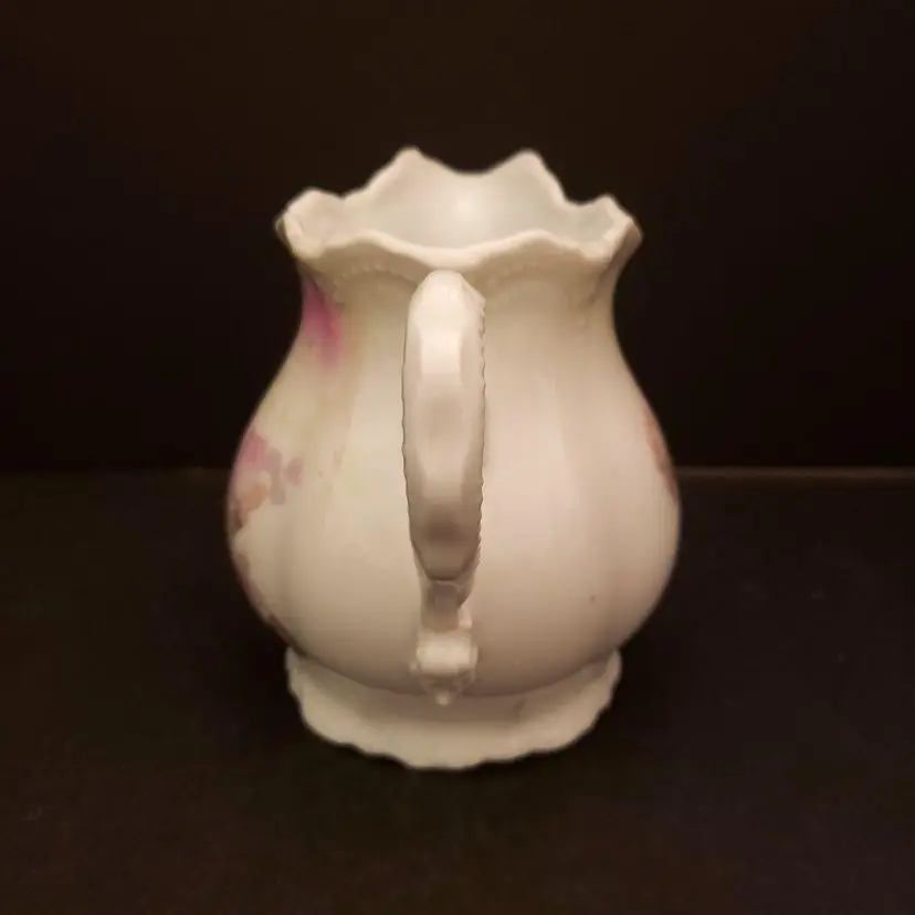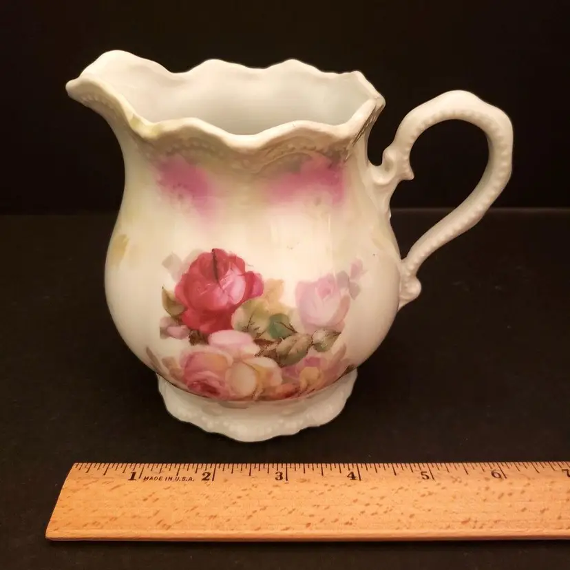 Beautiful antique water jug or cream pitcher with ornate ruffled rim and pretty pink roses transfer design. Mark reads, "Luechtenburg Germany". White and pink and green leaves and hints of green beading around the outer rim. Early 1900's.