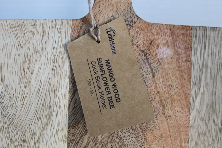 The Lexi Home Mango Wood Sunflower Bee Cookbook Holder is a charming and rustic addition to any kitchen. A decorative mango wood cookbook stand by Lexi Home featuring a sunflower and bee motif on a white inlay with original retail tags attached. The medium-sized holder in tones of brown adds a touch of warmth to your kitchen decor while serving its practical purpose of keeping your cookbook open or on display. With its free-standing mounting, it is easy to place anywhere in your kitchen for quick access to your favorite recipes. Made from durable mango wood, this rectangular cookbook holder features a single compartment with a farmhouse style design.