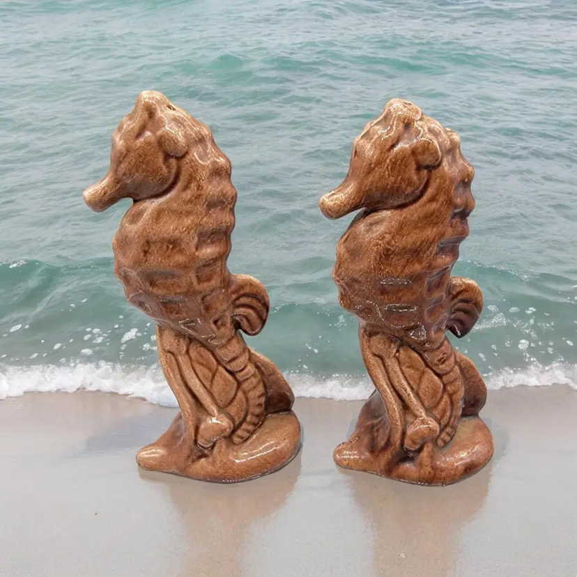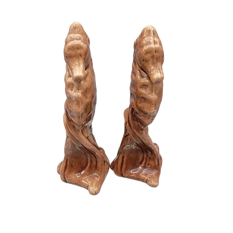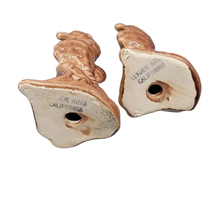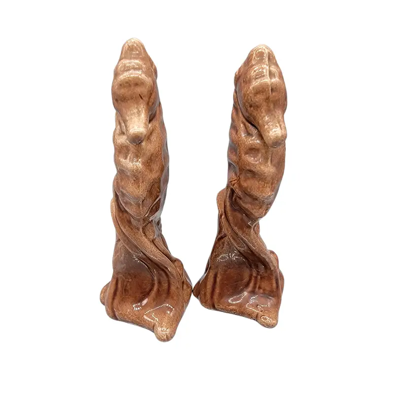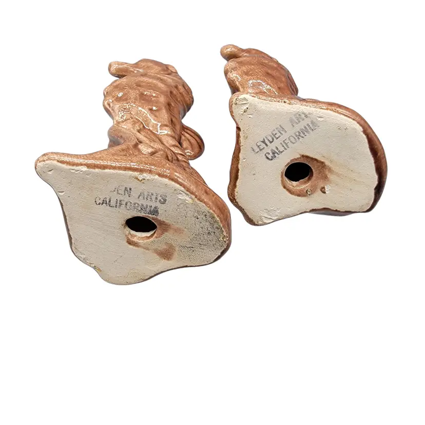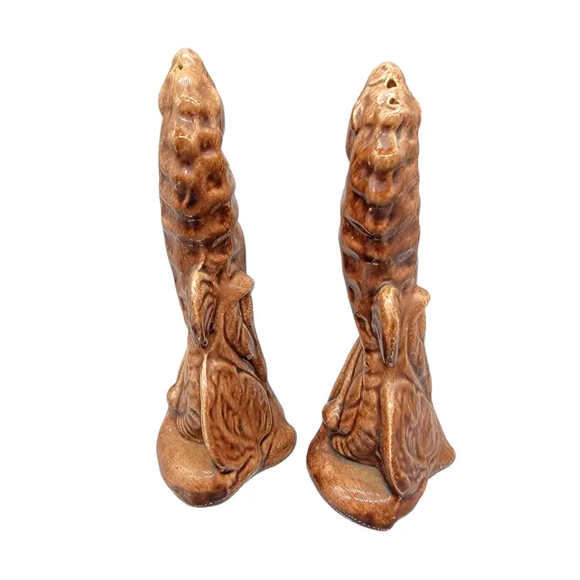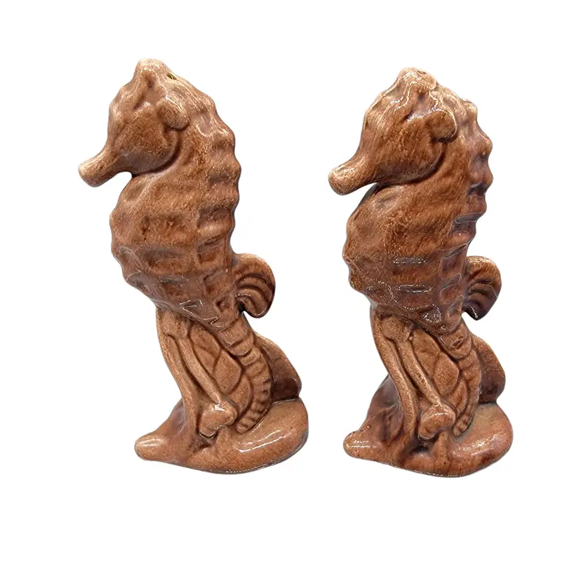 Vintage set of brown Leyden Arts California Pottery Seahorse shakers. Condition: pre-owned; no chips or cracks; no longer have stoppers. Measurements approximately: 4.5" tall, 2" long, 1.75" wide SKU: Shakers-B
