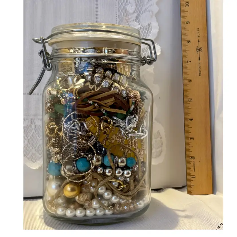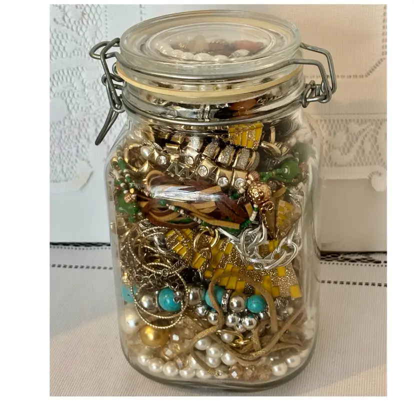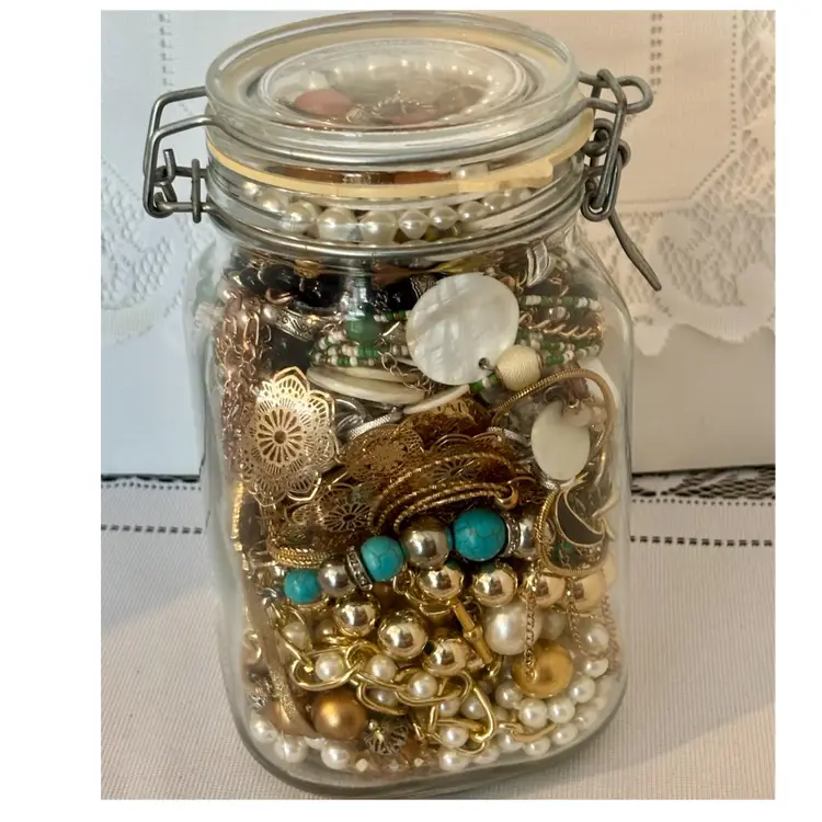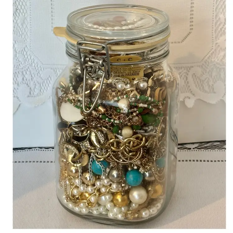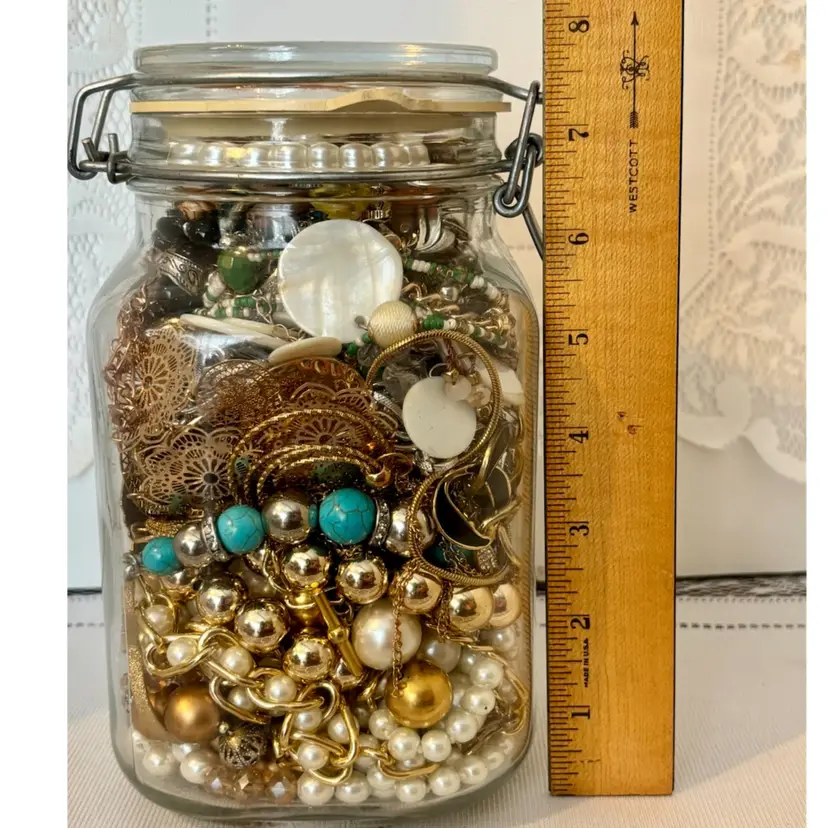 At least 30 pieces of wearable jewelry, unless I accidentally missed something Glass jar included! Weighs 5lbs. 10 ozs.