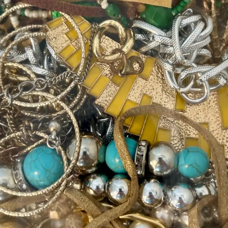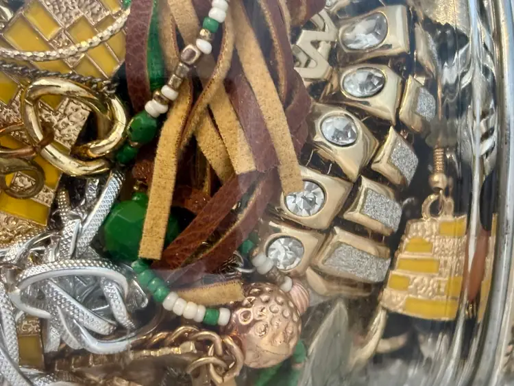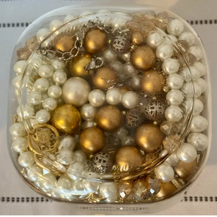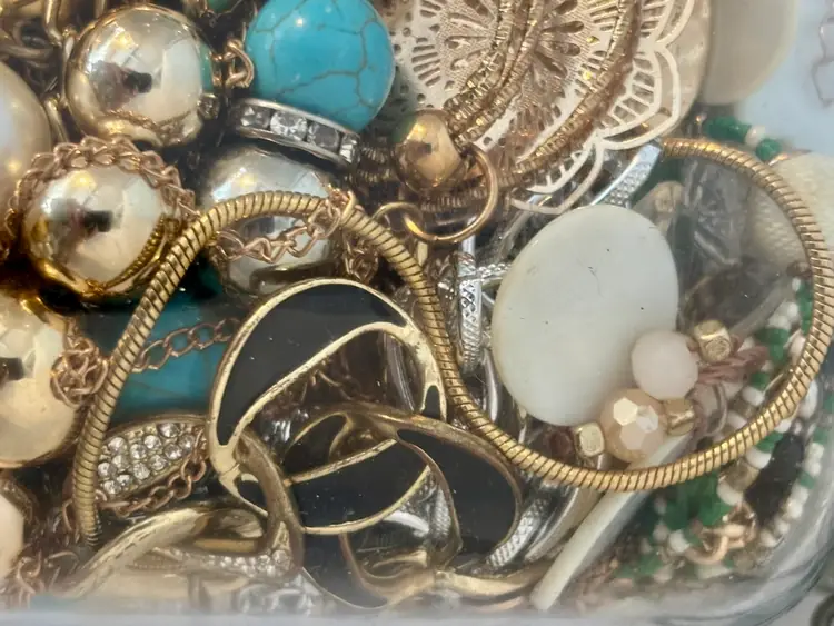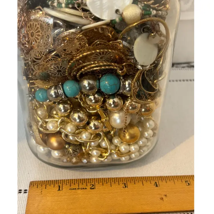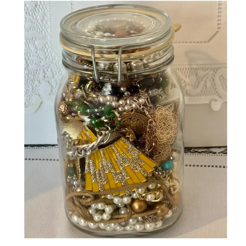 At least 30 pieces of wearable jewelry, unless I accidentally missed something Glass jar included! Weighs 5lbs. 10 ozs.