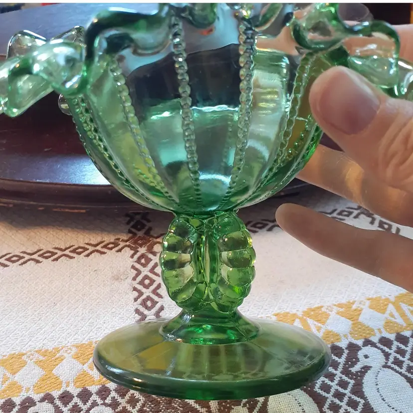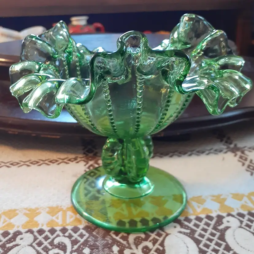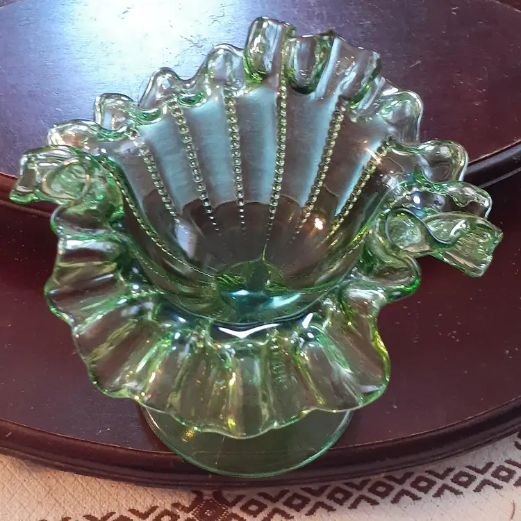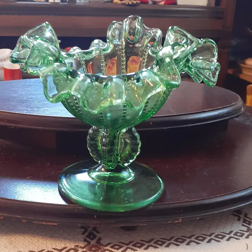 5 inches tall, 6" wide ruffle to ruffle, but 4" bowl. No chips or cracks.