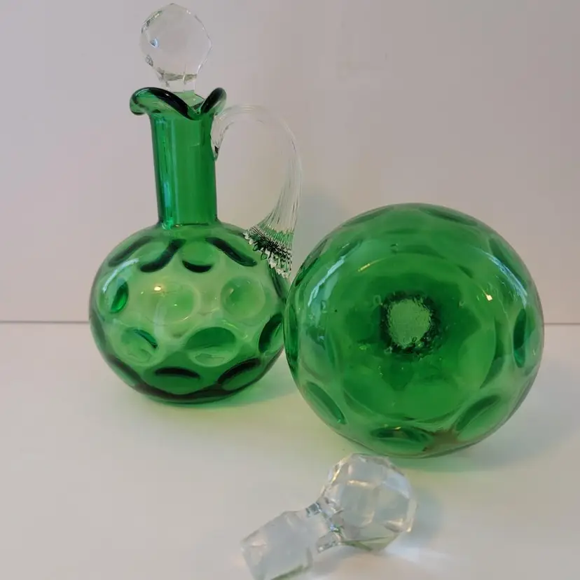Set Of 2 LG Wright Glass Green Coin Dot Optic Cruets There are chips to underside of stoppers Displays beautifully & still fully functional! 6.5" tall (with stopper)