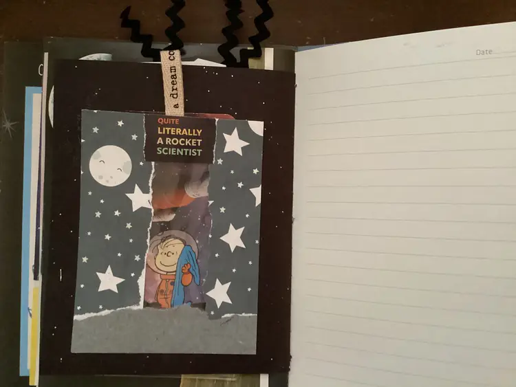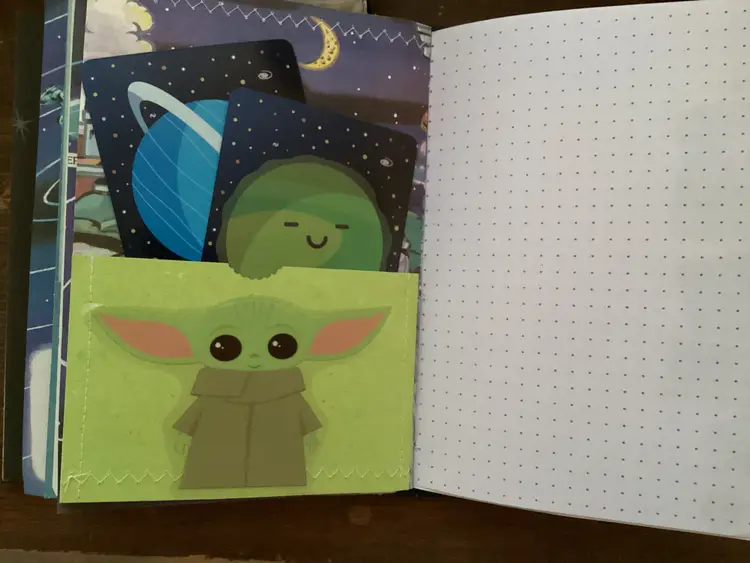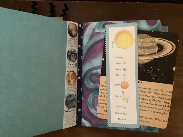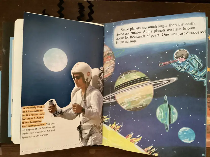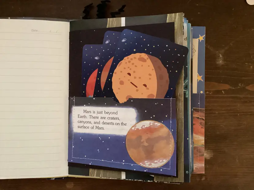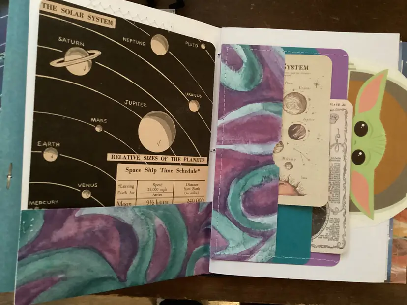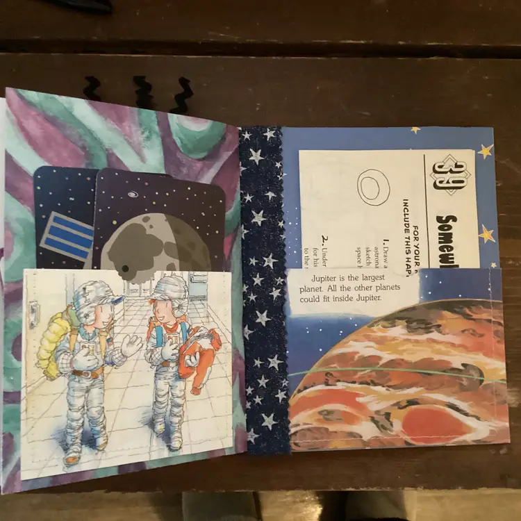 6x7 3/4” Little Golden Book called The First Book of Planets. 54 pages with lots of writing space, journaling cards, pockets, interactive items (like dot to dot; coloring page, etc), original pages from the book and mostly original ephemera. Mainly aimed towards children, but not recommended for those under the age of 6.