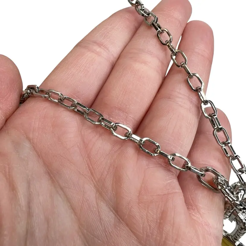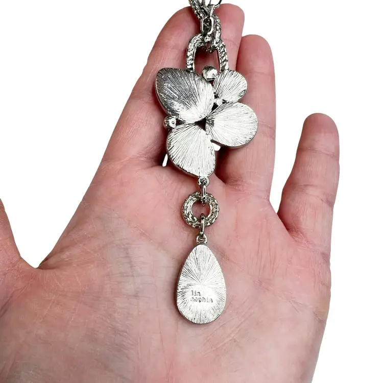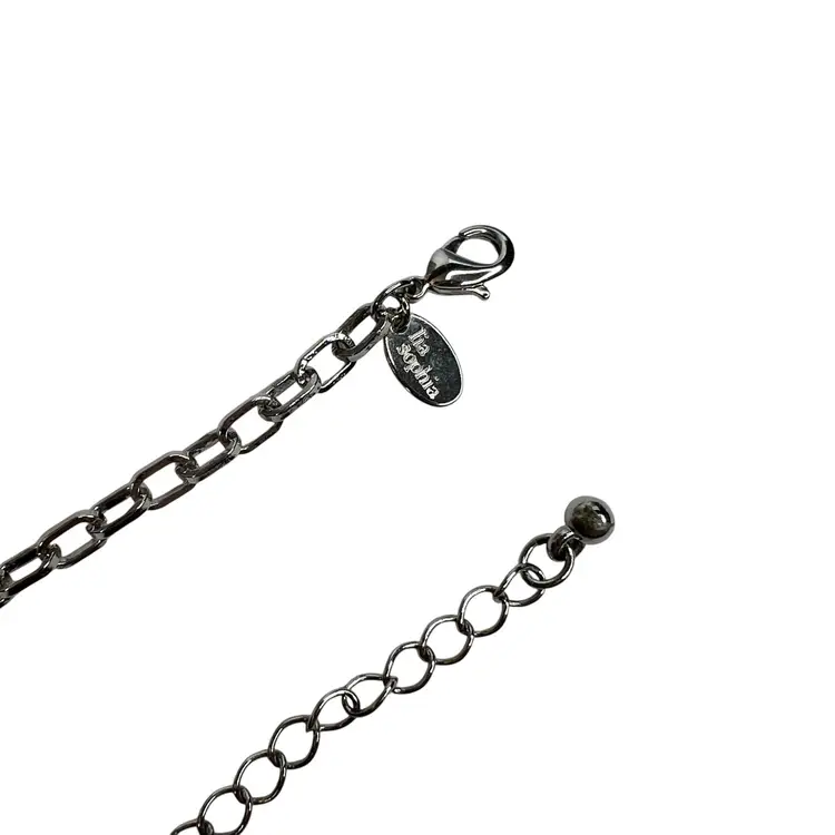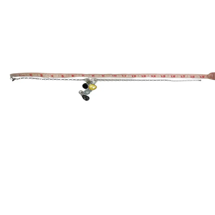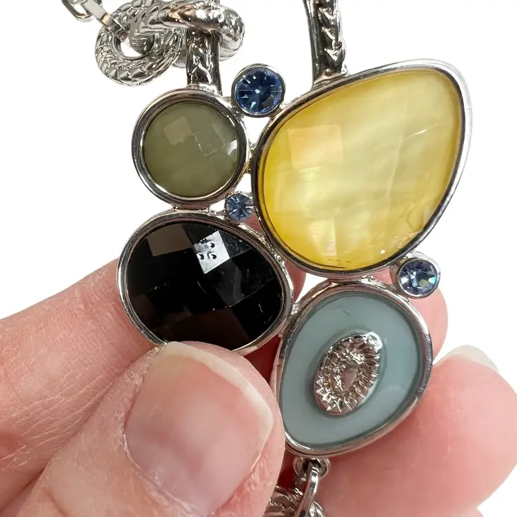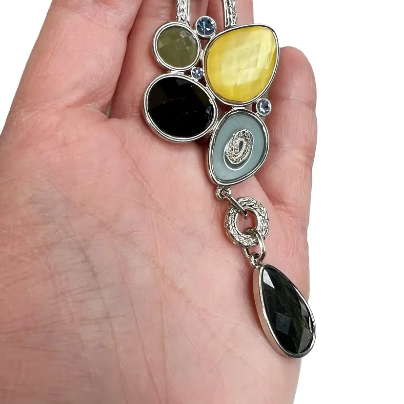 Lia Sophia Azure Multi Stone Colored Silvertone Pendant Y Drop Necklace. In good preowned condition with small indentations to one of the black faceted stones. Silver tone link chain. Y drop styling with an asymmetrical pendant of multi colored acrylic & resin stones. Lobster claw closure with extender.