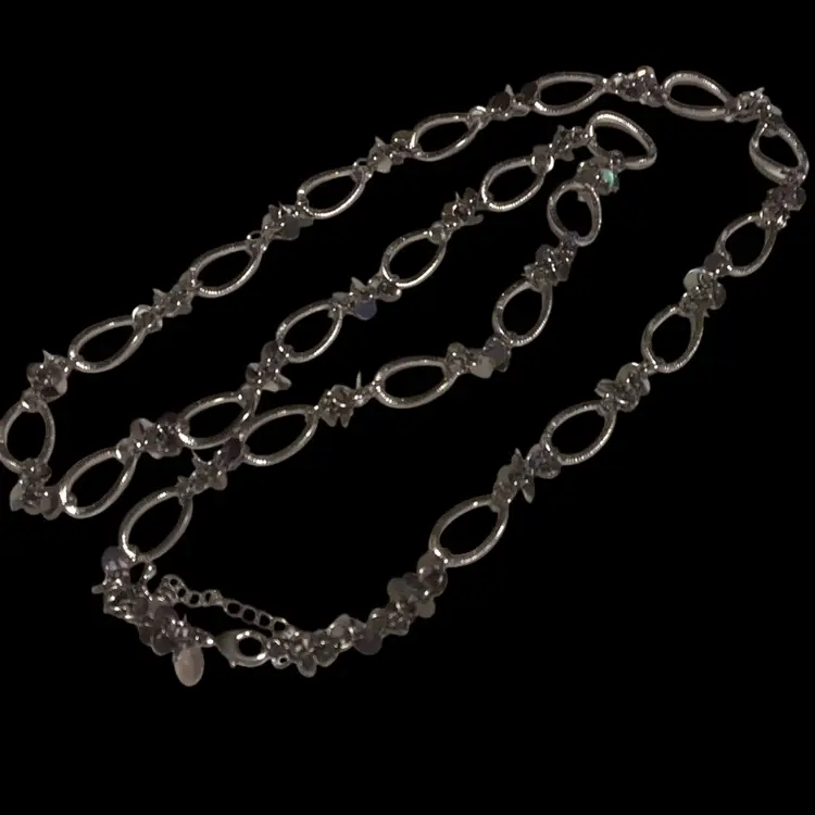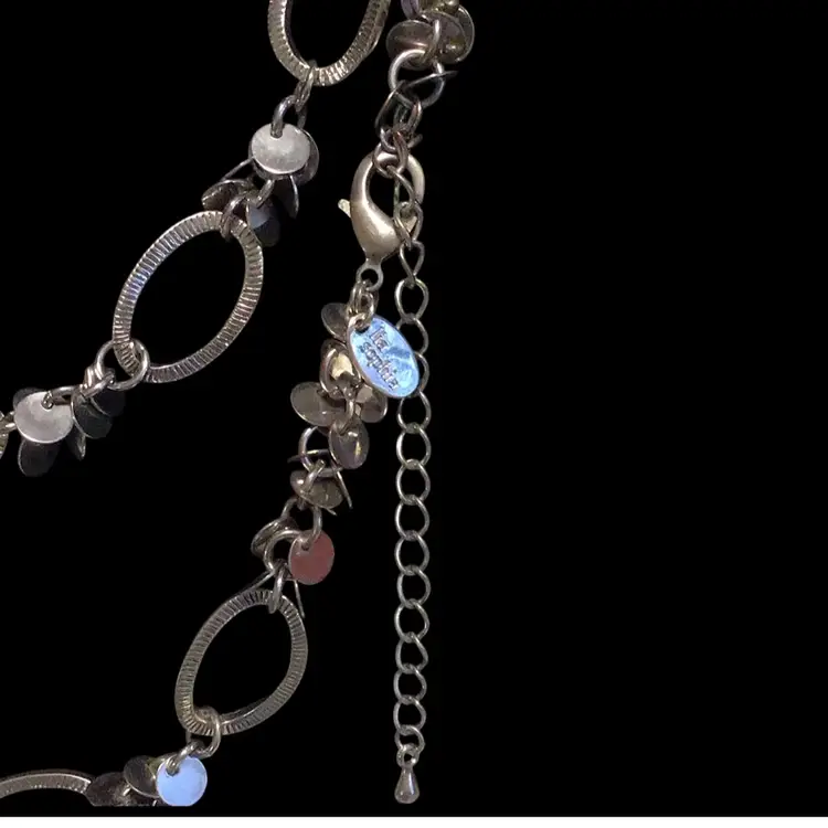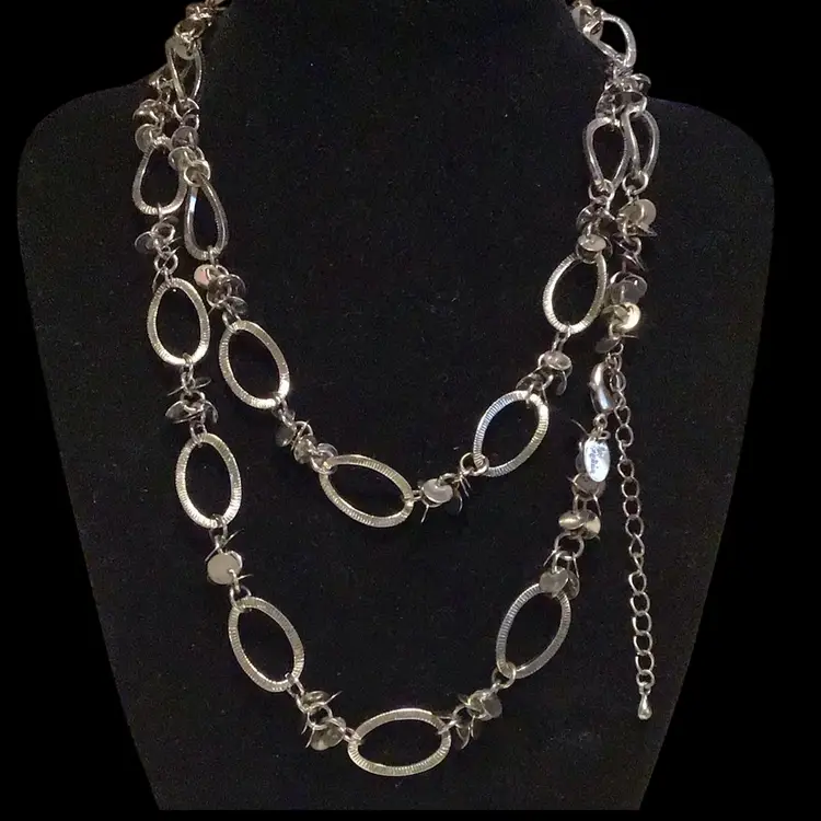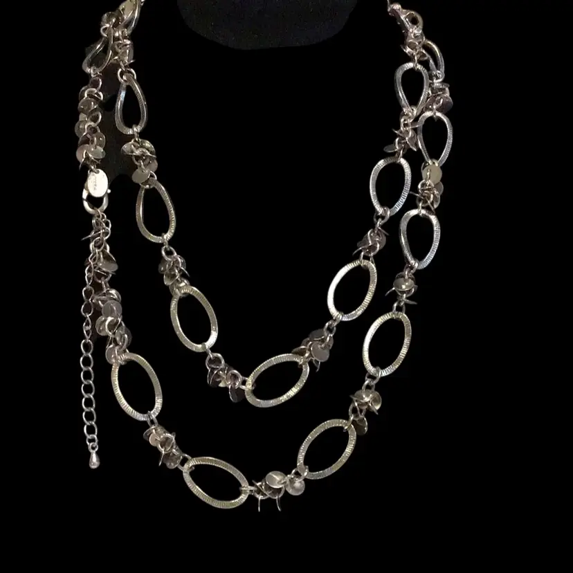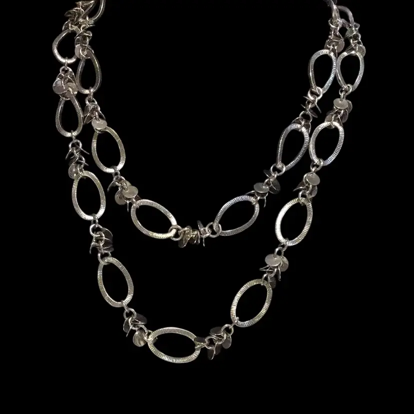 35” Gala coin charm, silver tone oval textured links with smaller cha cha coins in between. #462