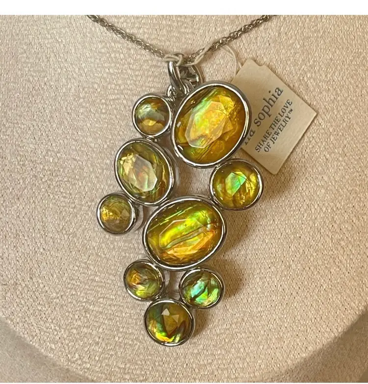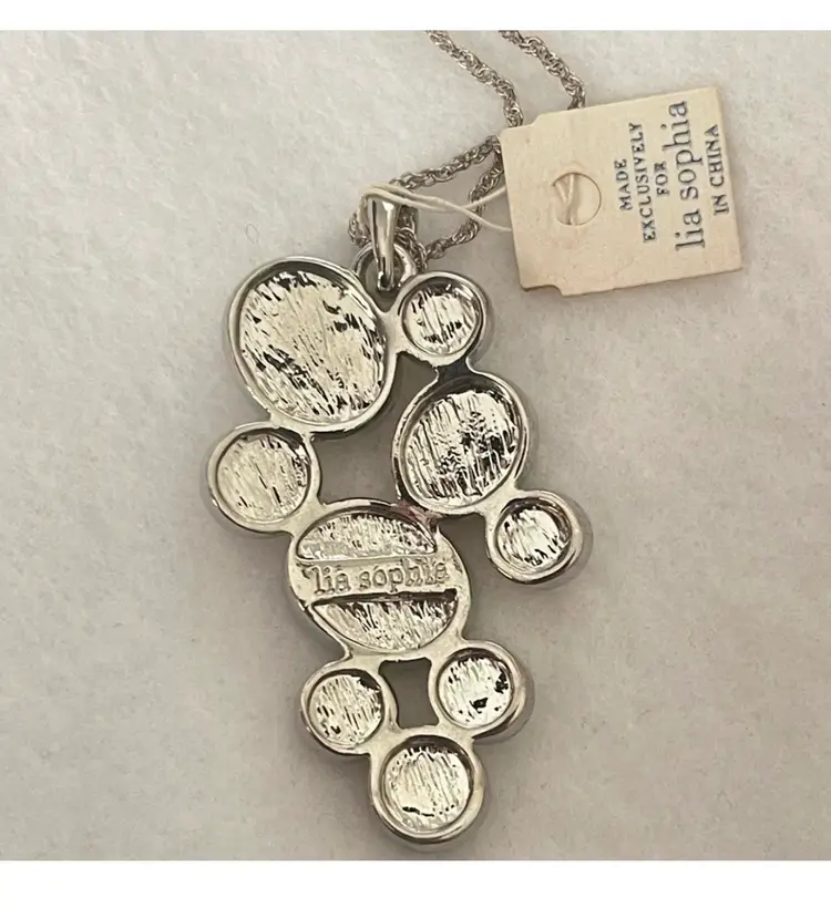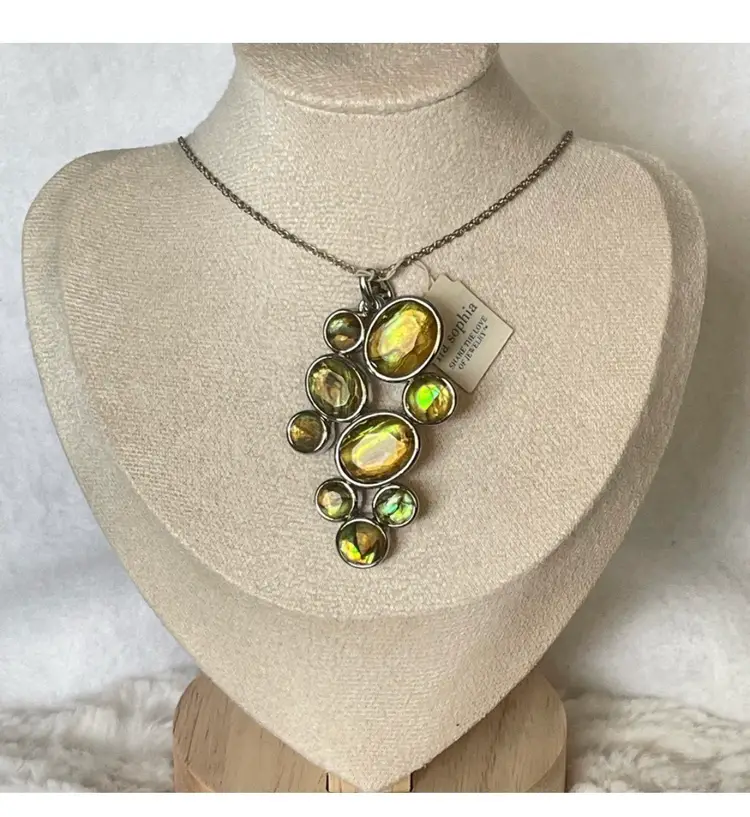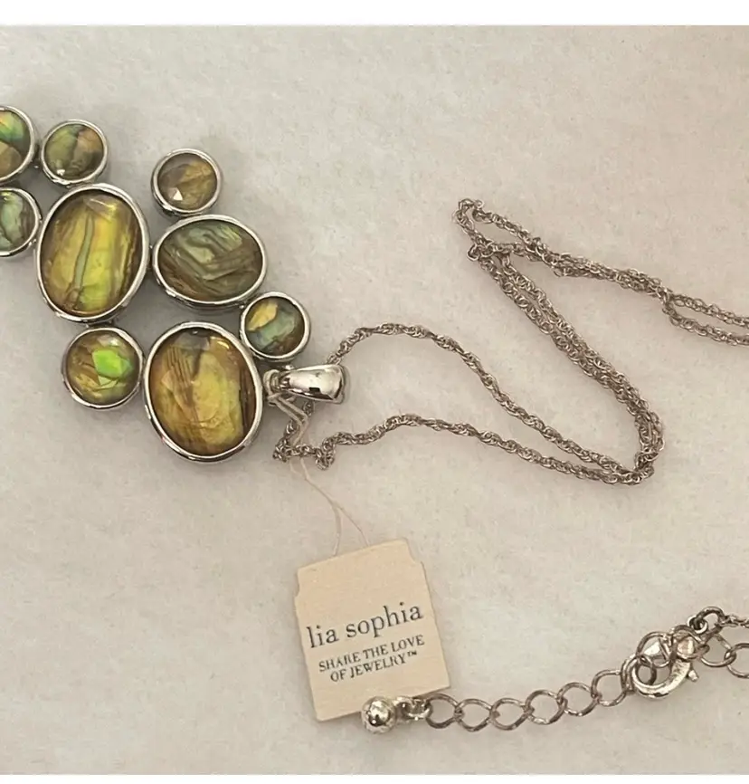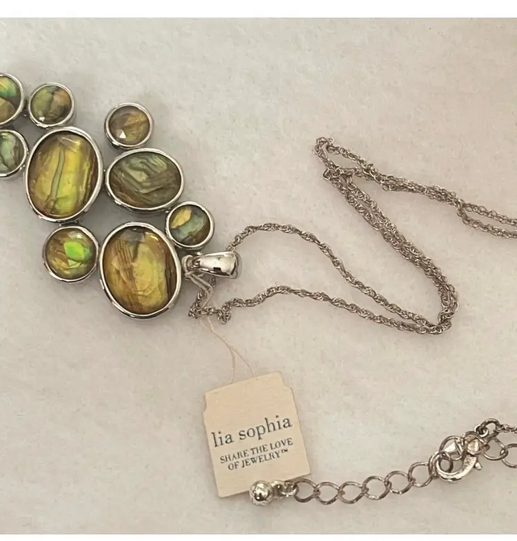 Vintage Signed Lia Sophia green abalone pendant and necklace Features chandelier like vibrant green abalone set in a sleek design. Approximately 14-20” which includes extender. New old stock with original tags.