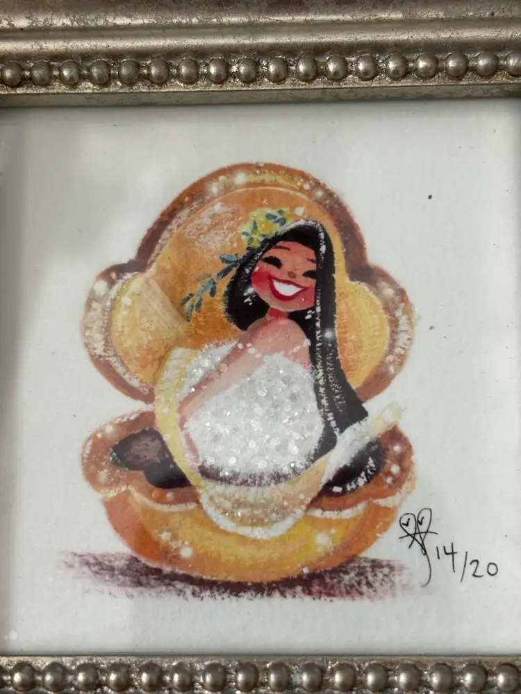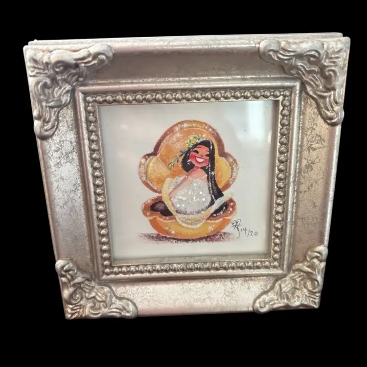 Adorable mermaid print by Disney artist Liana Hee In adorable silver tone frame. No damage Total size with frame: 4.24x4.25”