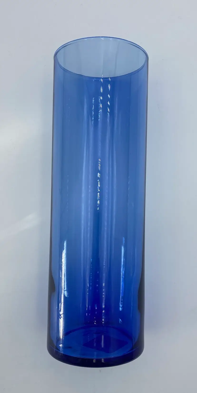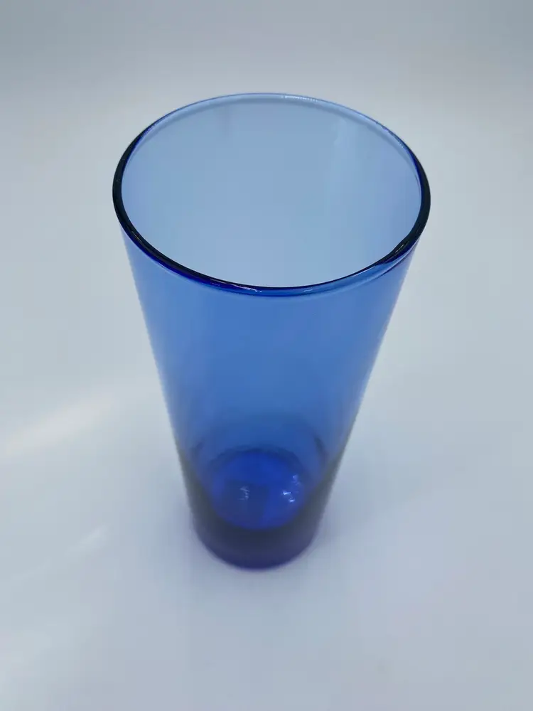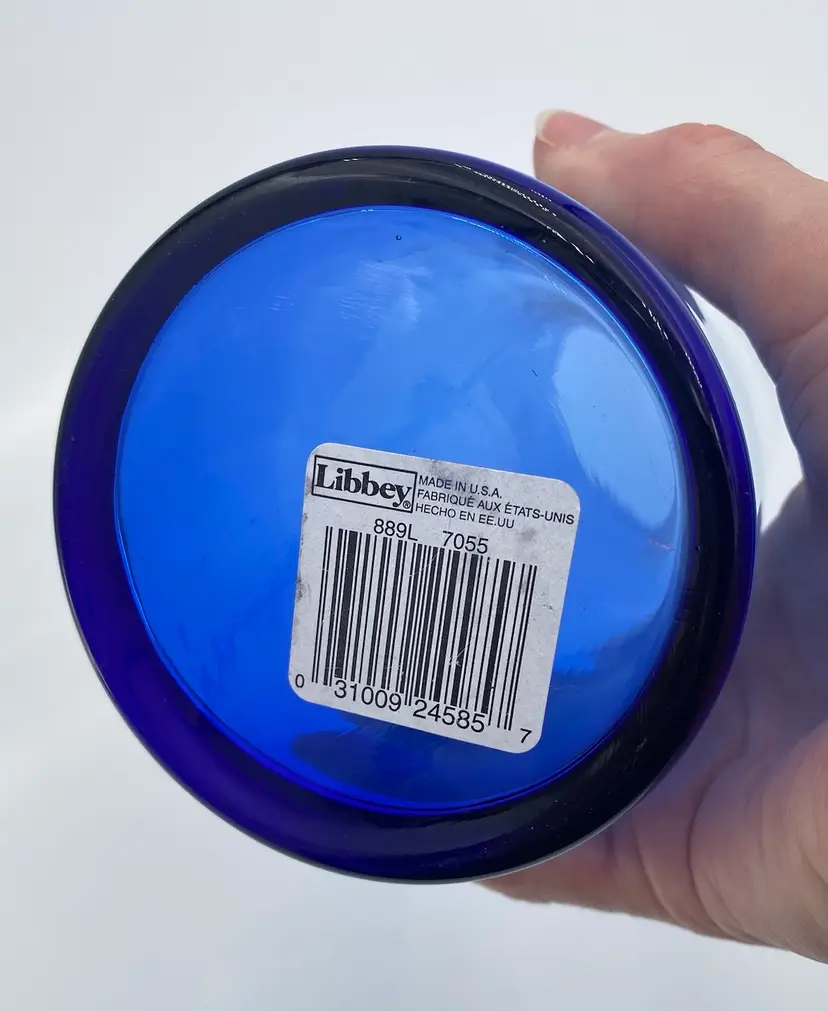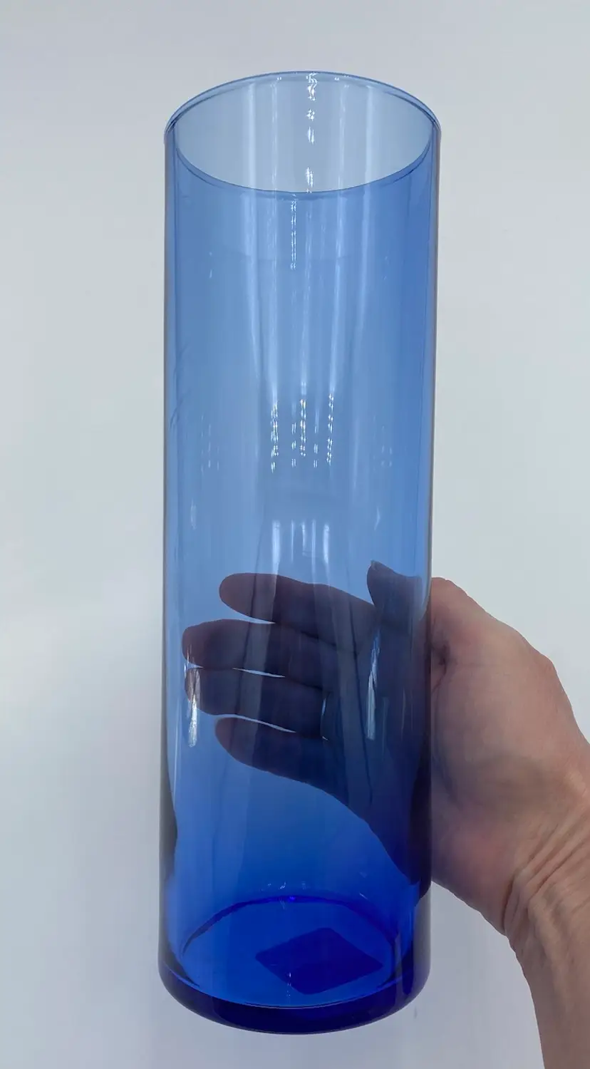 This beautiful decorative vase from Libbey will be a lovely addition to your home. The Mediterranean Blue color of the glass adds a touch of elegance to any room, and the cylinder measures 10.4 inches in height and 3.4 inches in width. The vase was manufactured in the United States and comes with its original sticker. The vase weighs 1 pound and 3.7 ounces and is perfect for displaying flowers or as a decor piece, such as holding sliced fruit or ornamental balls.