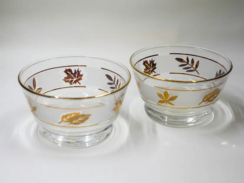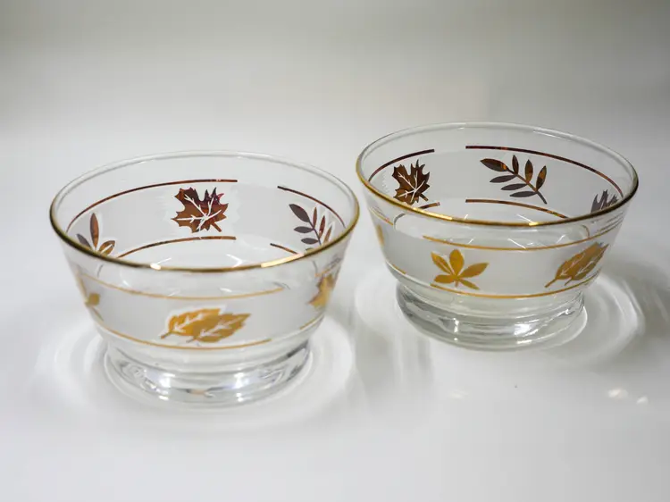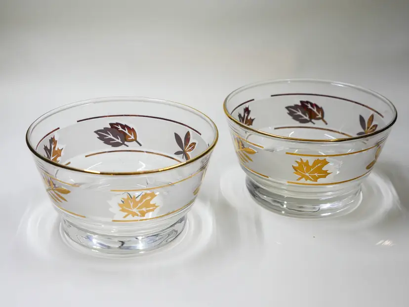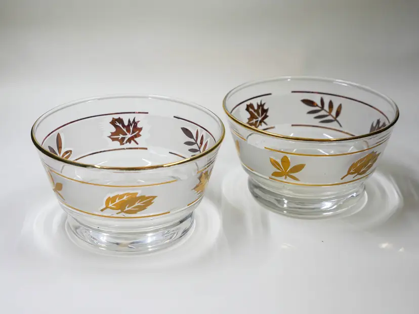 A pair of small, MCM, clear glass bowls decorated with gold leaves and a gold rim.. The bottoms are flat and engraved with a cursive letter "L," for Libbey Glass Company. Lovely pieces for your fall decor or table in excellent condition with no chips or cracks. They look unused with no washing wear. Approx. size: 3.75" wide x 2.25" tall each.