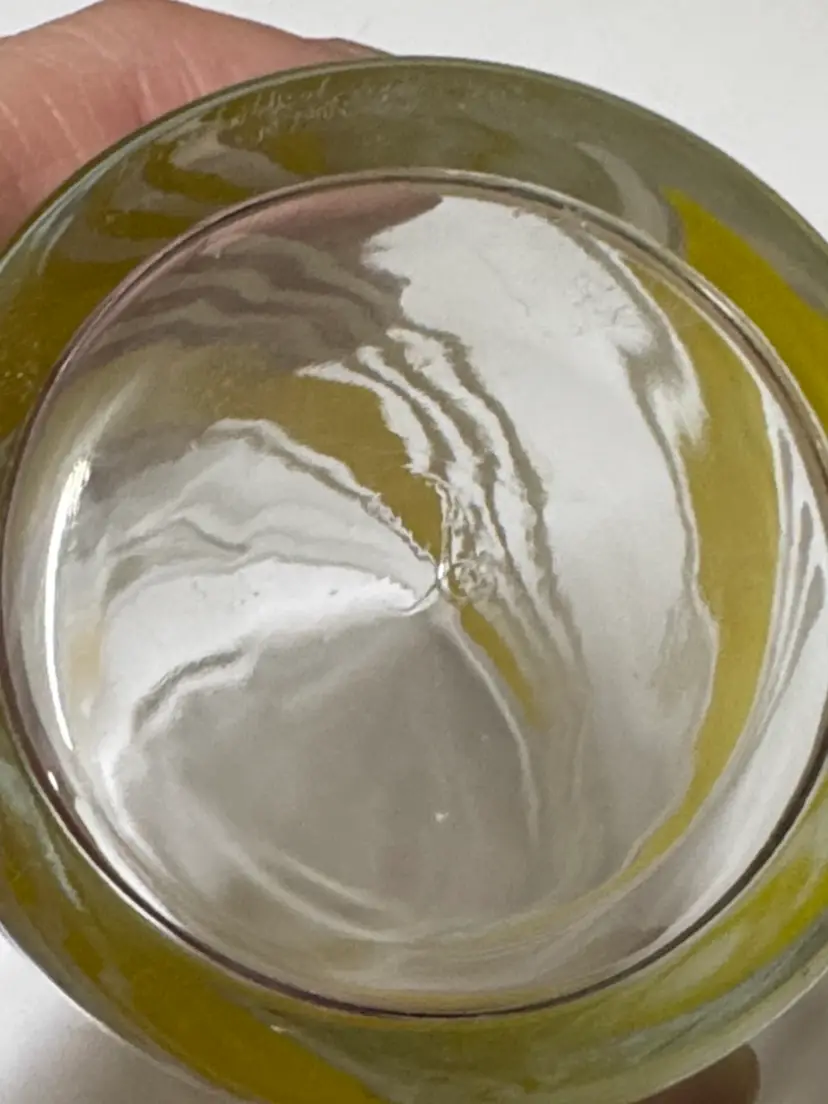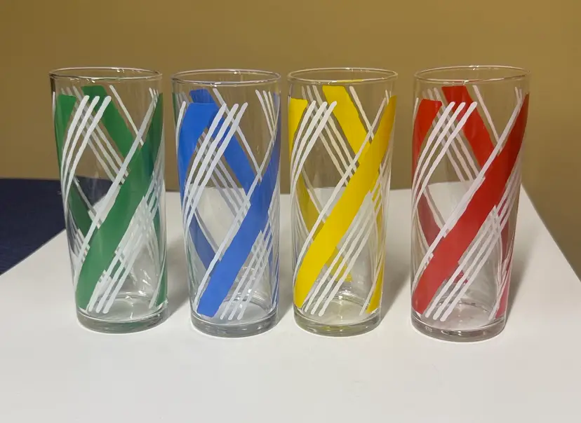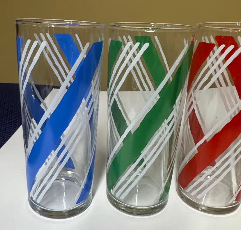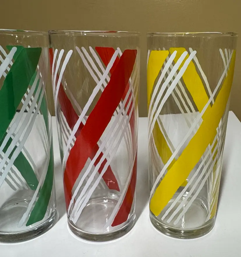 Set of four glass tumblers with vibrant stripes. Features green, blue, yellow, and red colors. Vintage Libbey Glass Striped Drinking Glass Tumblers 6” tall 2 3/8” diameter All are in excellent condition with no breaks or chips (40116265)