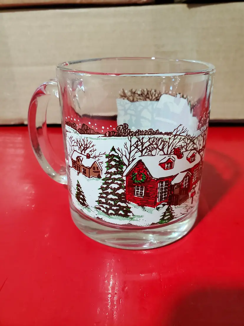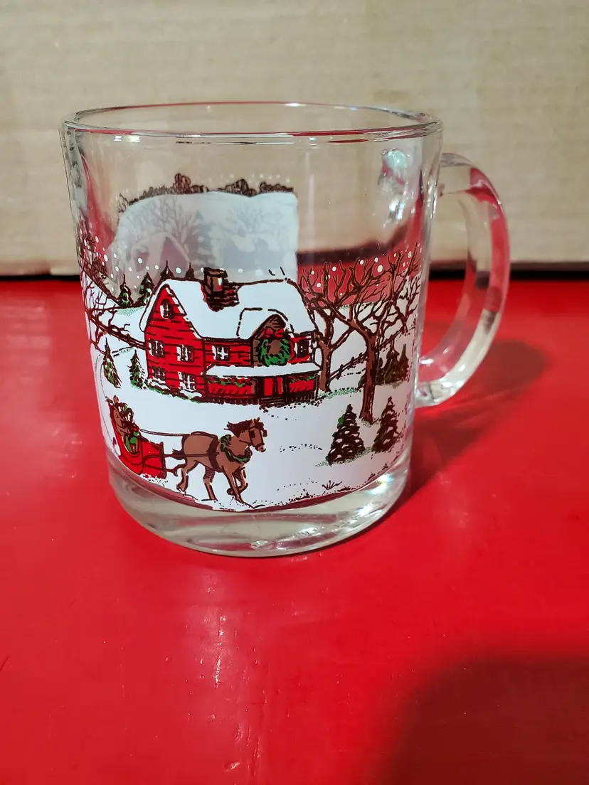 The Libbey Glass Winter Village Clear Mug features a festive snow scene and horse sleigh design, perfect for enjoying hot or cold beverages during the winter season. Made of glass with a clear color, this original American-themed mug set includes a tea cup and coffee mug. Manufactured in the United States, this mug is a collectible piece that adds a touch of Christmas spirit to your kitchen or home decor.
