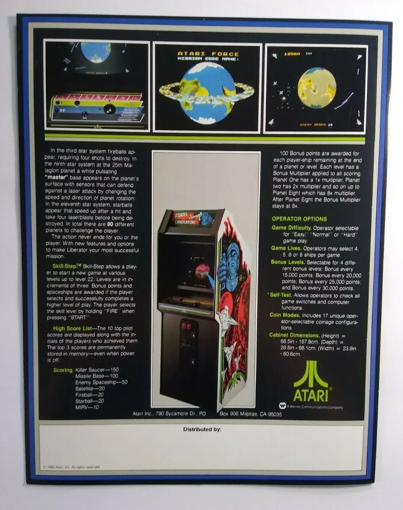 Arcade: Flyer Theme: Science Fiction Modified Item: No Country/Region of Manufacture: United States Original/Reproduction: Original Year: 1982 Game Title: Liberator Brand: Atari