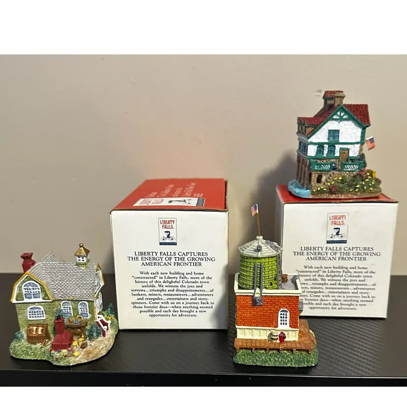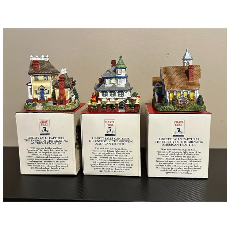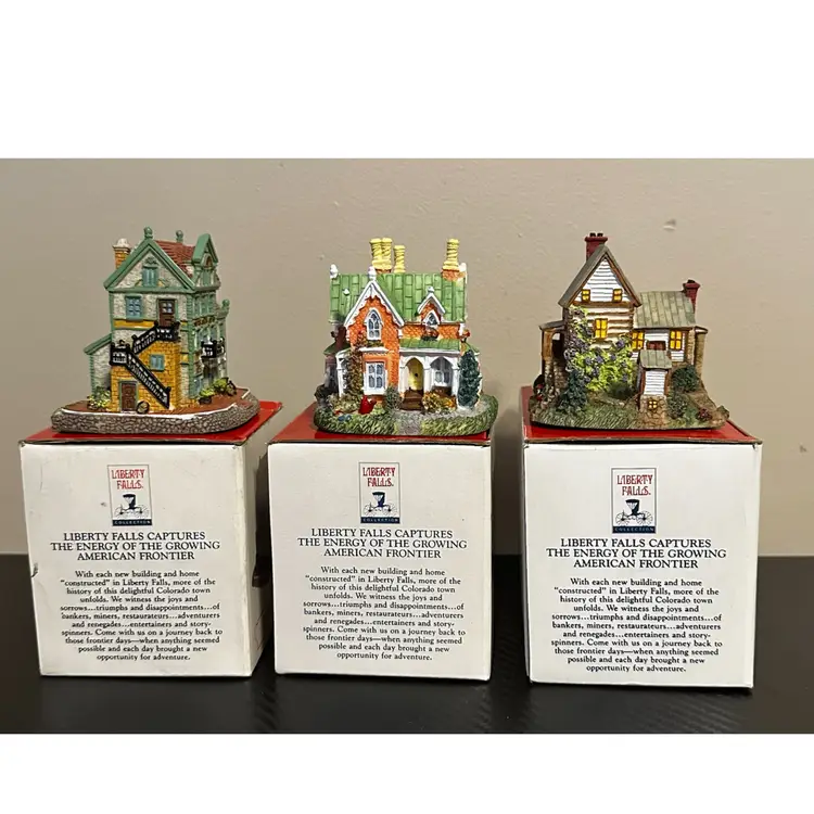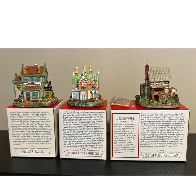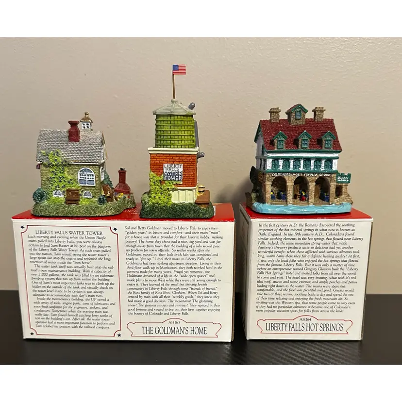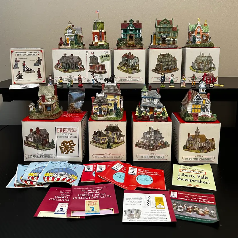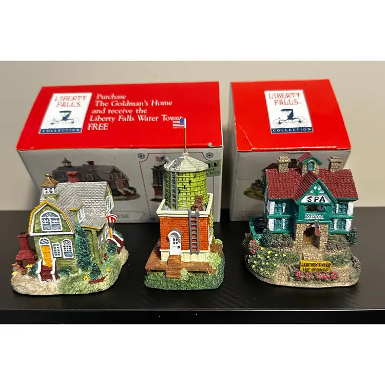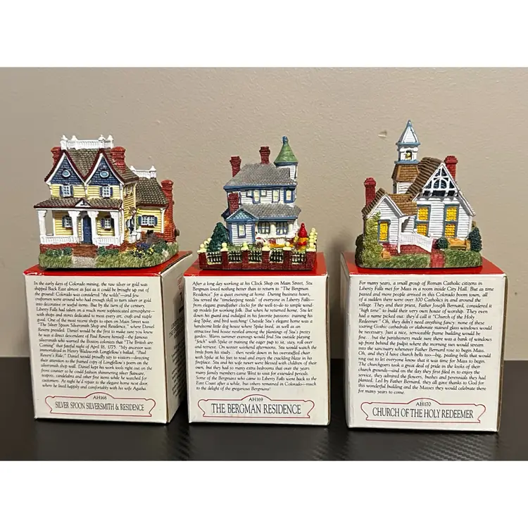 Liberty Falls collection including: AH161 - 1998 Accessory Set, NOTE missing Zeb Wilson but have an additional piece of horse pulling plow with man, includes box. AH162 - 1998 Accessory Set, all figures but no box. AH163 - 1998 The Goldman’s House, NOTE chimney of stove has been repaired, box included. AH173 - 1998 Liberty Falls Water Tower, same box as AH163. AH164 - 1998 Liberty Falls Hot Springs, box included. AH165 - 1998 White’s Wheel Co., NOTE dot on roof repaired, box included. AH166 - 1998 Wellbourne Estate & Garden Club, box included. AH167 - 1998 Billy Atwell’s Homestead, includes bag of Fool’s Gold Nuggets, box included. AH168 - 1998 Silver Spoon Silversmith & Residence, box included. AH169 - 1998 The Bergman Residence, box included. AH170 - 1998 Church of the Holy Redeemer, box included.