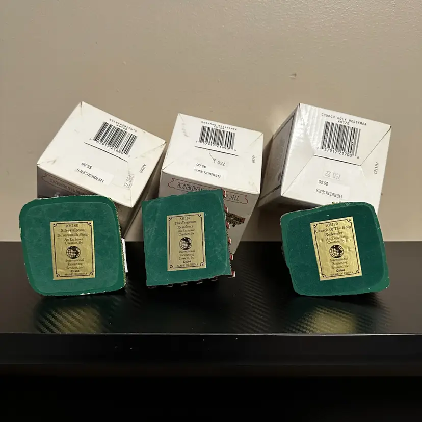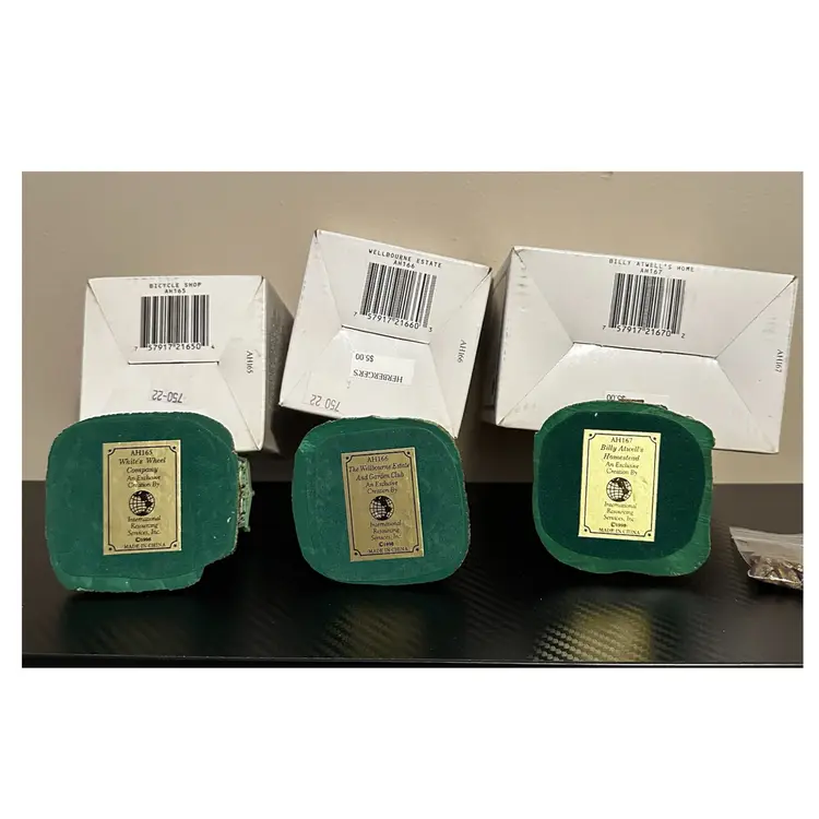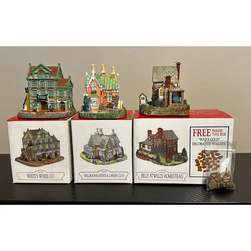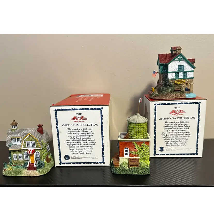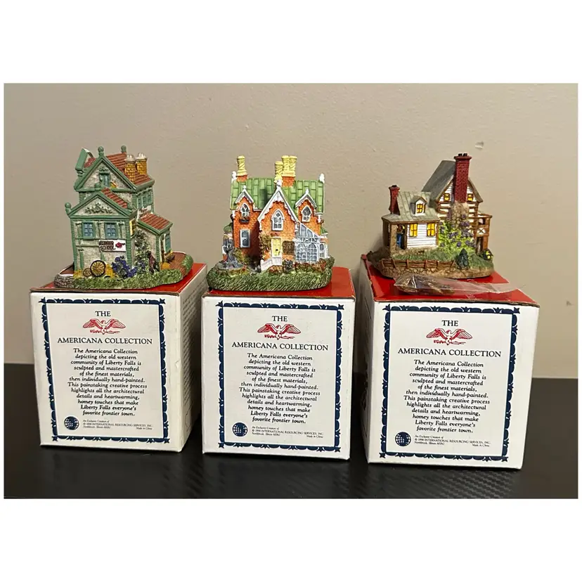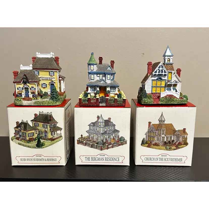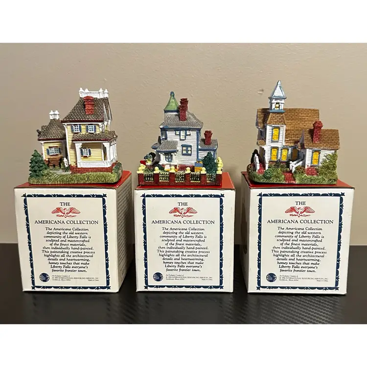 Liberty Falls collection including: AH161 - 1998 Accessory Set, NOTE missing Zeb Wilson but have an additional piece of horse pulling plow with man, includes box. AH162 - 1998 Accessory Set, all figures but no box. AH163 - 1998 The Goldman’s House, NOTE chimney of stove has been repaired, box included. AH173 - 1998 Liberty Falls Water Tower, same box as AH163. AH164 - 1998 Liberty Falls Hot Springs, box included. AH165 - 1998 White’s Wheel Co., NOTE dot on roof repaired, box included. AH166 - 1998 Wellbourne Estate & Garden Club, box included. AH167 - 1998 Billy Atwell’s Homestead, includes bag of Fool’s Gold Nuggets, box included. AH168 - 1998 Silver Spoon Silversmith & Residence, box included. AH169 - 1998 The Bergman Residence, box included. AH170 - 1998 Church of the Holy Redeemer, box included.