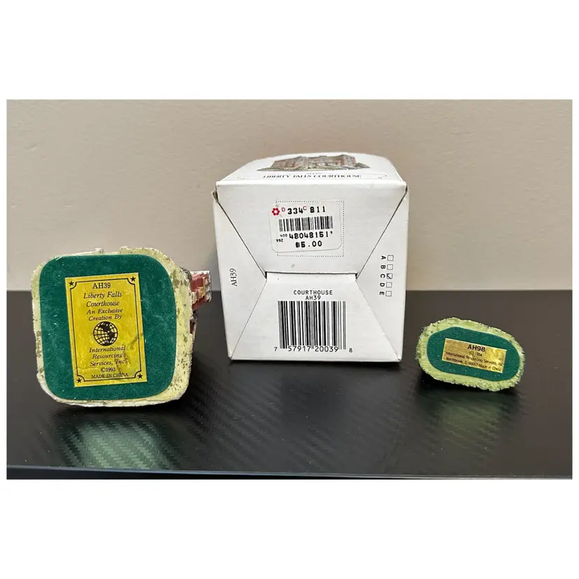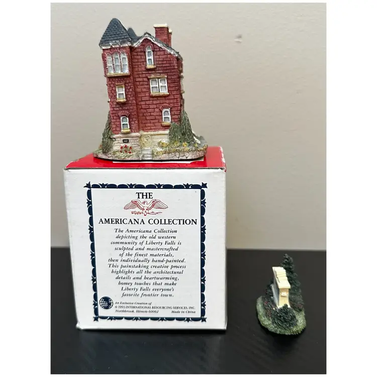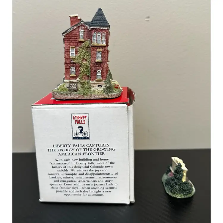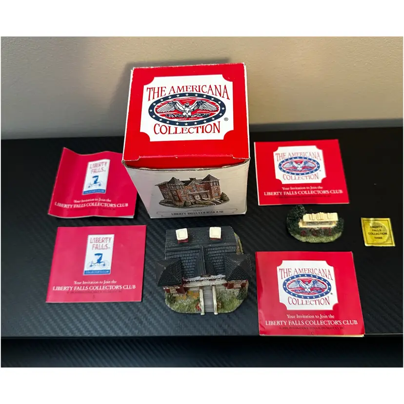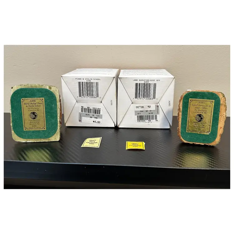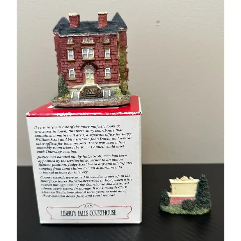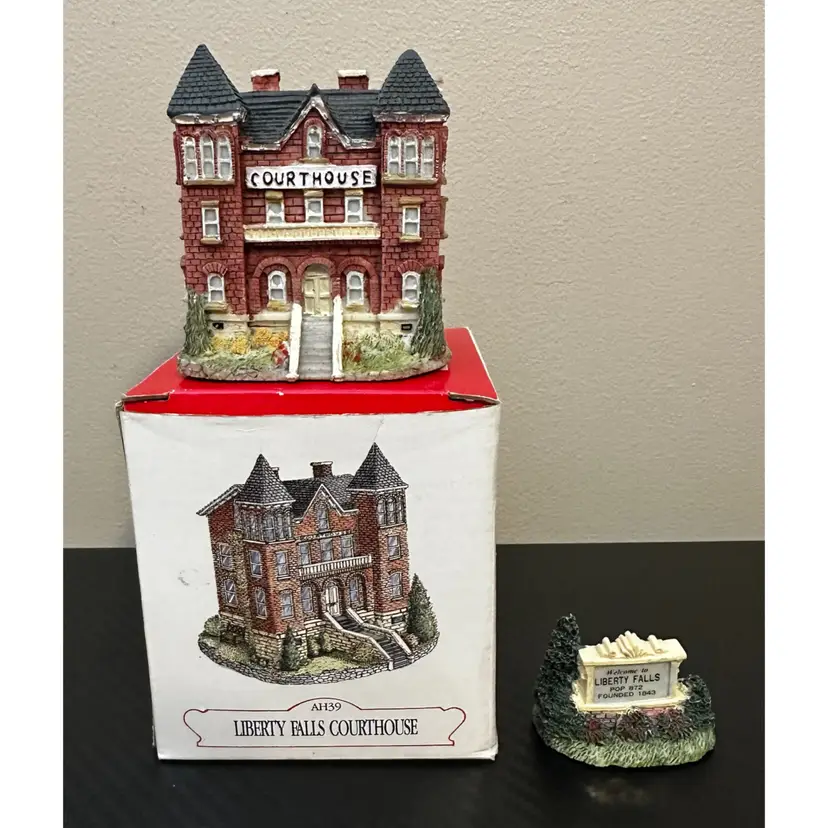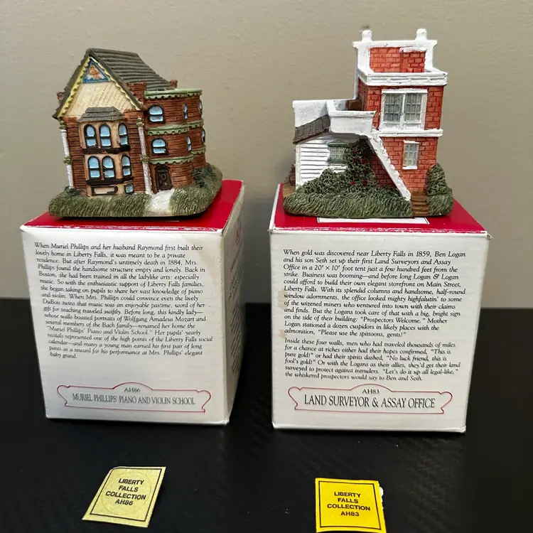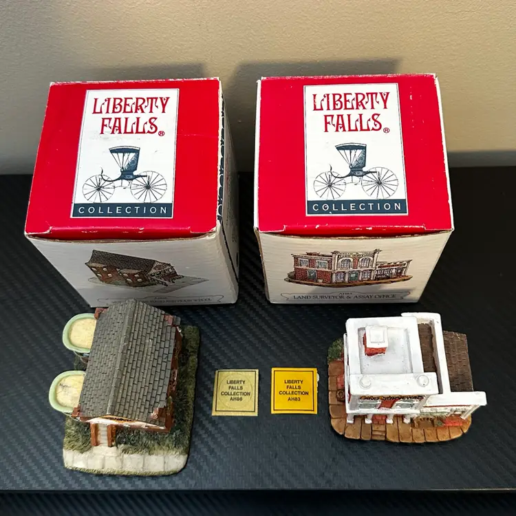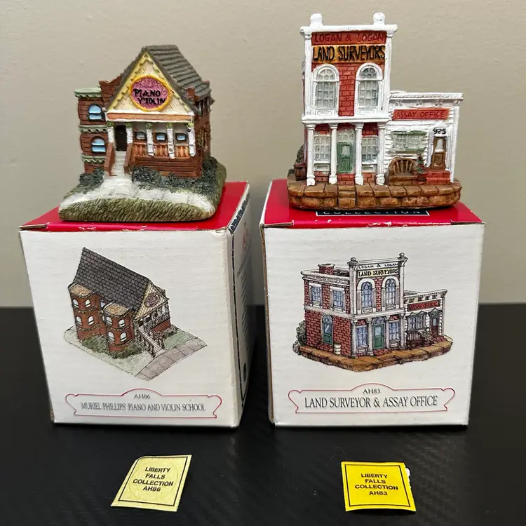 Liberty Falls Collection includes: AH98 - 1994 Liberty Falls Population and Welcome Road Sign, no box. AH39 - 1994 Liberty Falls Courthouse, with box. AH83 - 1995 Land Surveyor & Assay Office, with box. AH86 - 1995 Muriel Phillips’ Piano and Violin School, with box. AH52 - 1997 Miniature Accessory Set Painted Pewter, Hand Pump, Cow, 2 Benches, Flag Pole - with box.