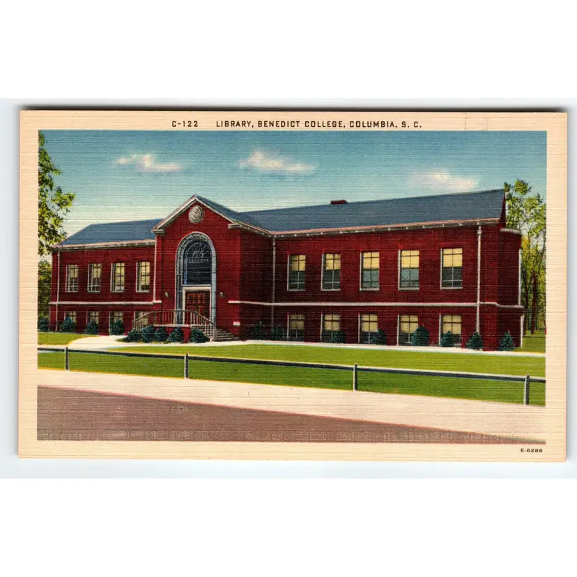This vintage postcard features the Benedict College Library building in Columbia, South Carolina. The postcard is an original linen print from 1940 and is in excellent condition. The front of the postcard showcases a beautiful image of the library, while the back is divided for writing. This postcard is a great addition to any collection of topographical postcards, or for those interested in historical libraries and buildings. The postcard is unposted and comes from a single unit set. The size of the postcard is standard (5.5 x 3.5 in) and it is an original print from Asheville. This postcard is a great way to add a piece of history to your collection and is perfect for those interested in South Carolina, North America, and the Linen (1930-1945) era.