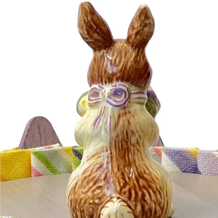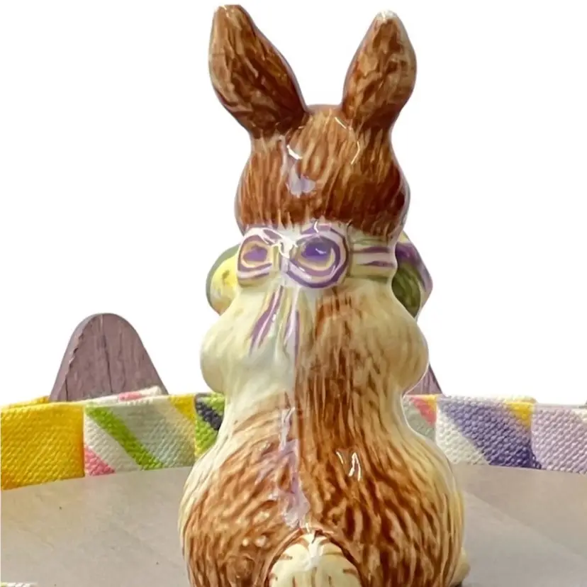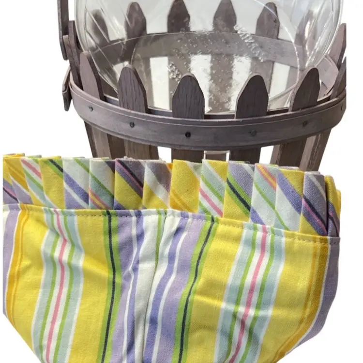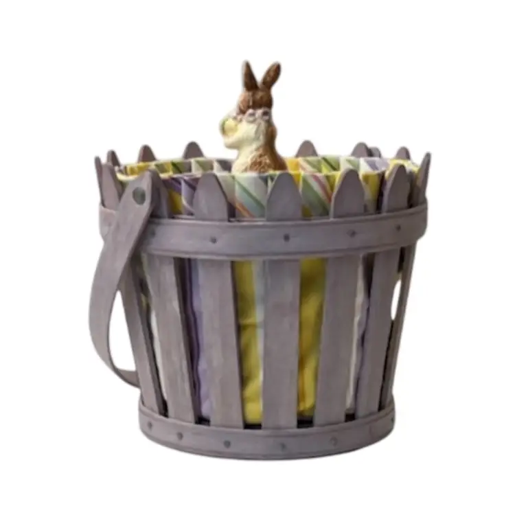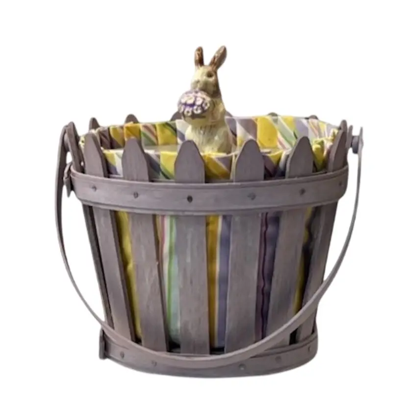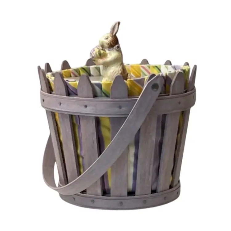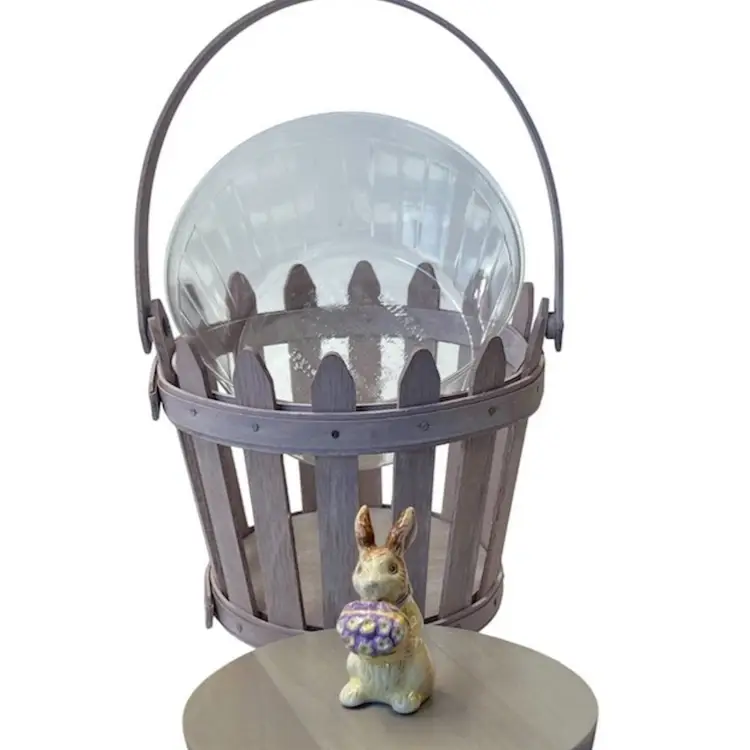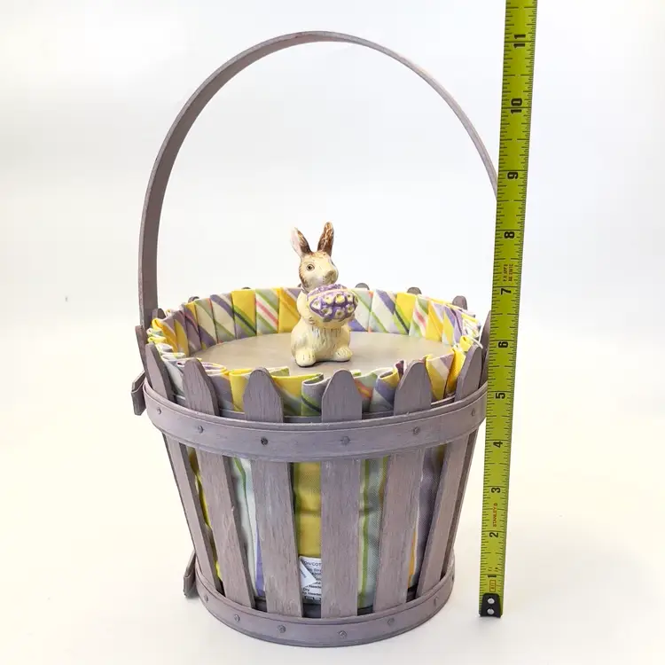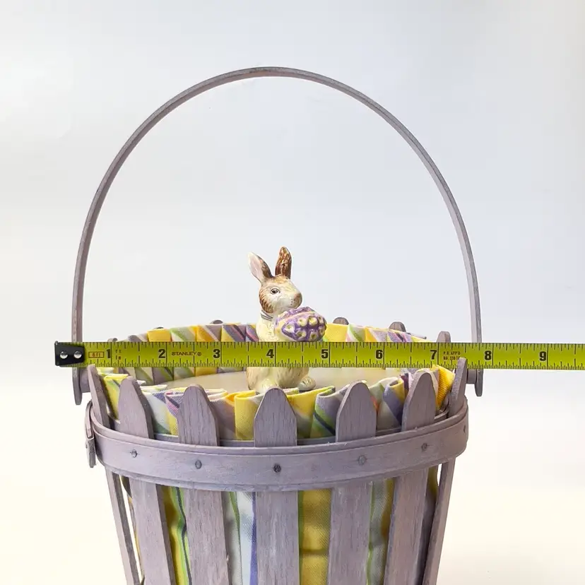 👉6x7” (11” w/handle) 👉 Longaberger Wood Picket Pail Easter Basket features a grey/lavender stained finish and a striped fabric liner with Plastic Protector Liner The Wood lid is adorned with a ceramic bunny knob. Longaberger baskets are handwoven and often sought after by collectors for their limited editions and unique designs. The company has been making baskets since the 1970s, continuing a tradition that began in 1896 in Dresden, Ohio 👉No Chips or Cracks 👉Review Photos for Best Condition Description 👉Sold as Shown