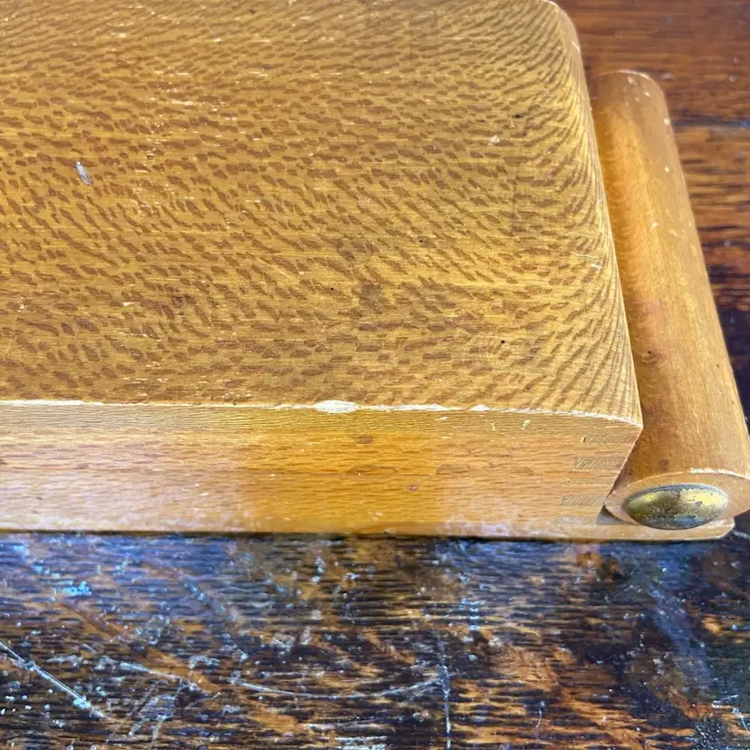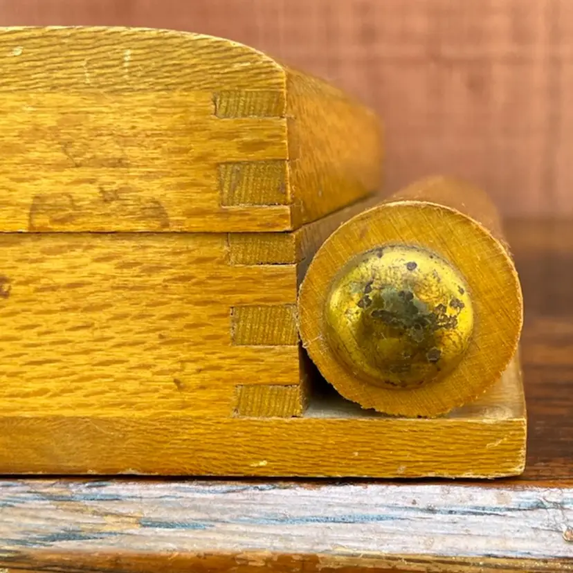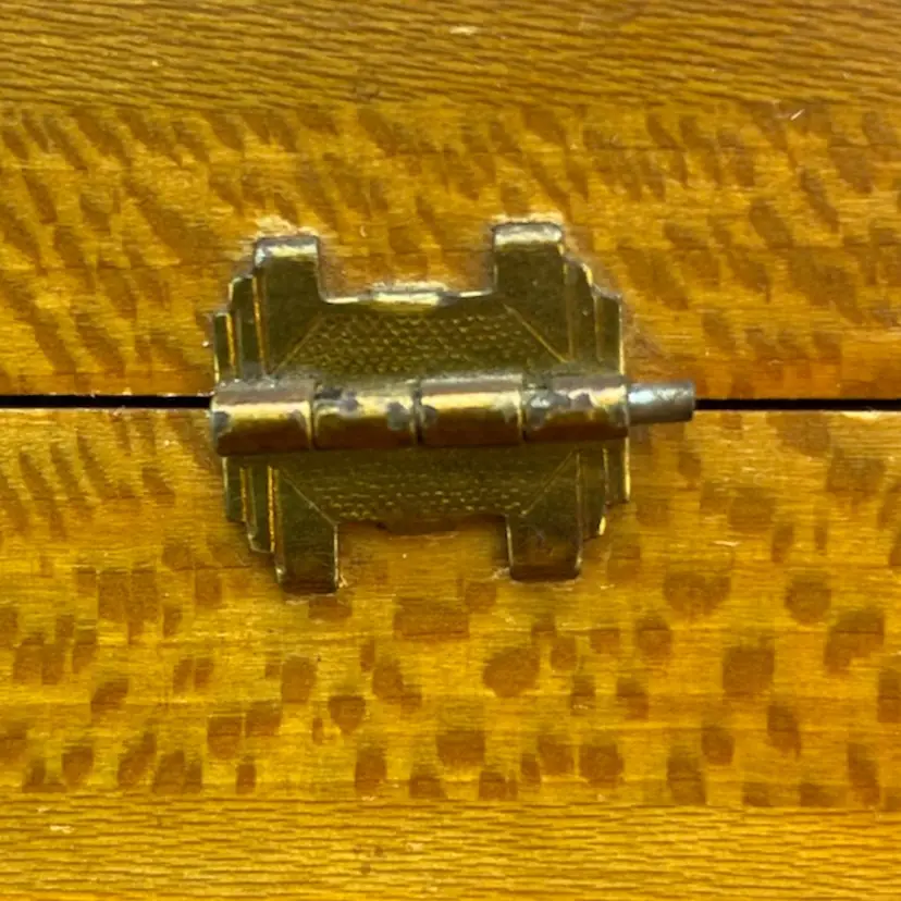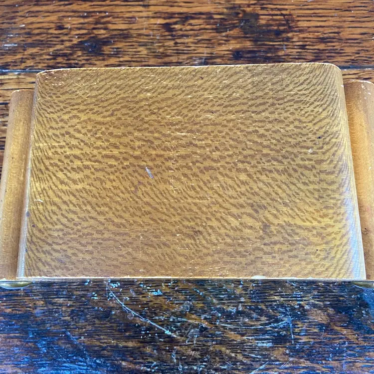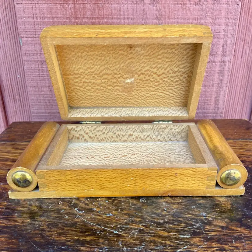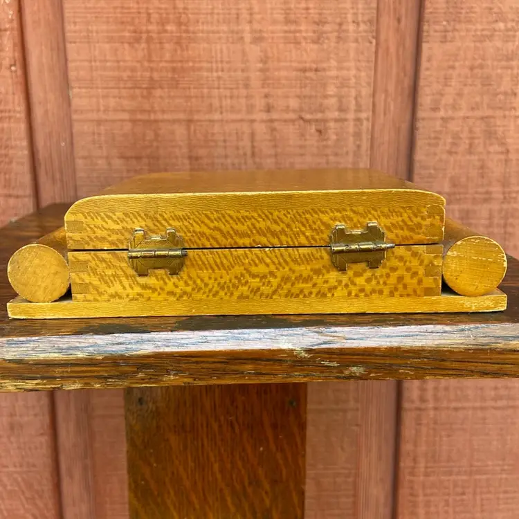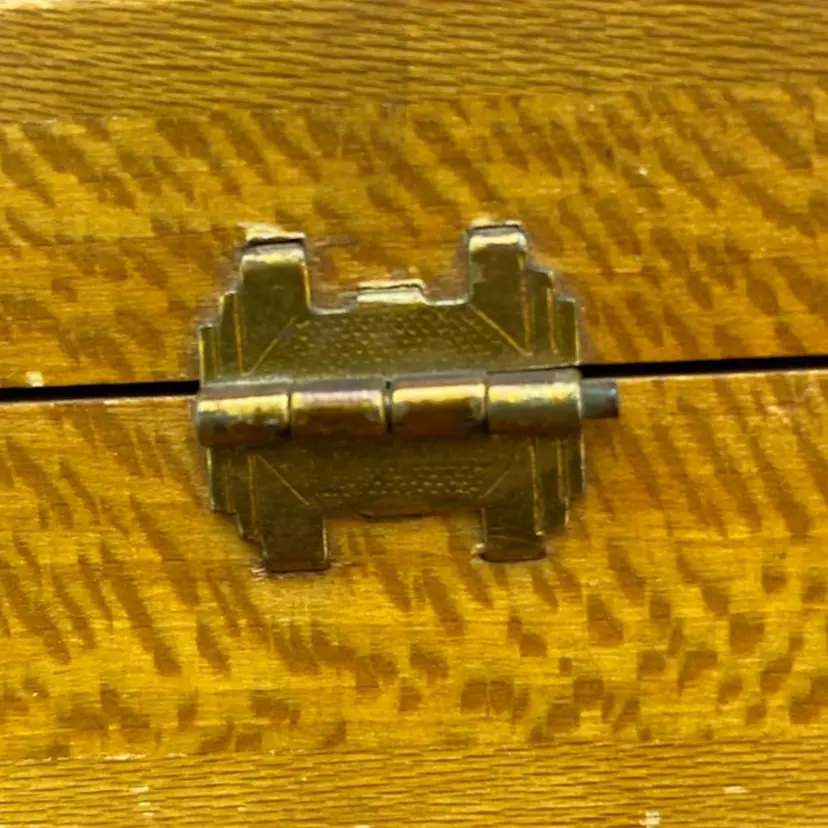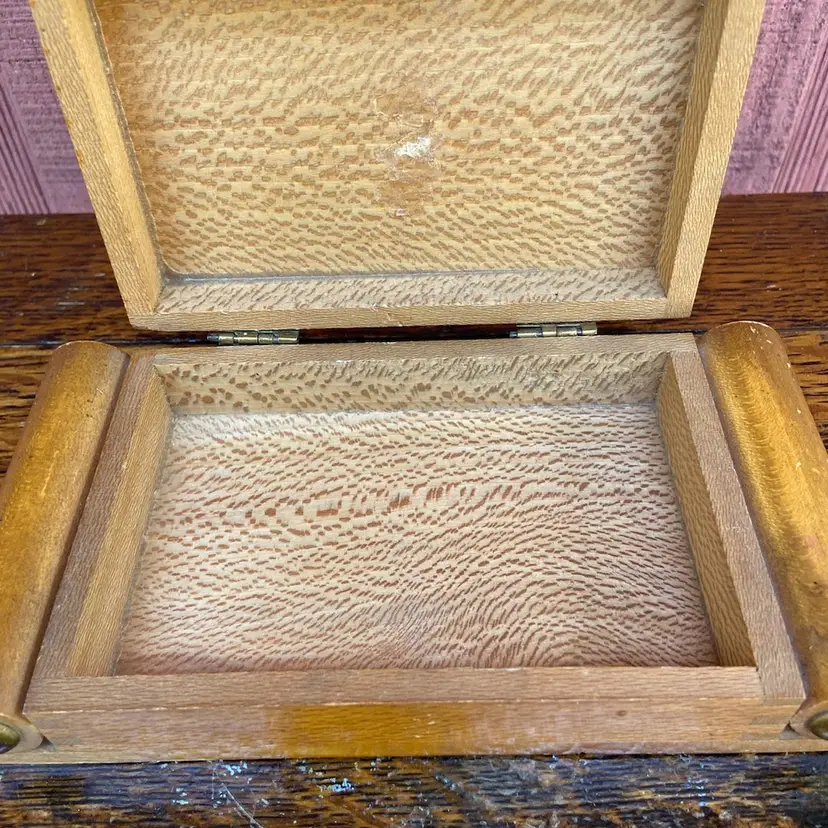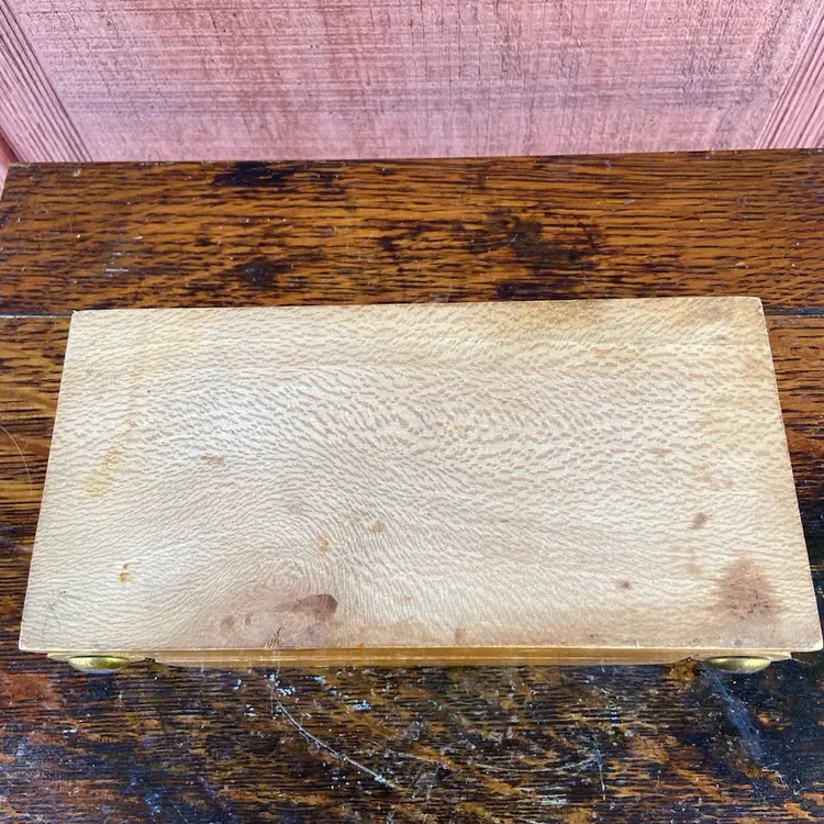 Approx 7”l x 3.5”d x 1.75”h. Inside (bottom) dimensions approx 4.75”l x 3”d x 7/8”h. Preowned condition. Some wear, dents and scratches. See images as part of description. Potentially some glue inside top lid. Could use a good cleaning.