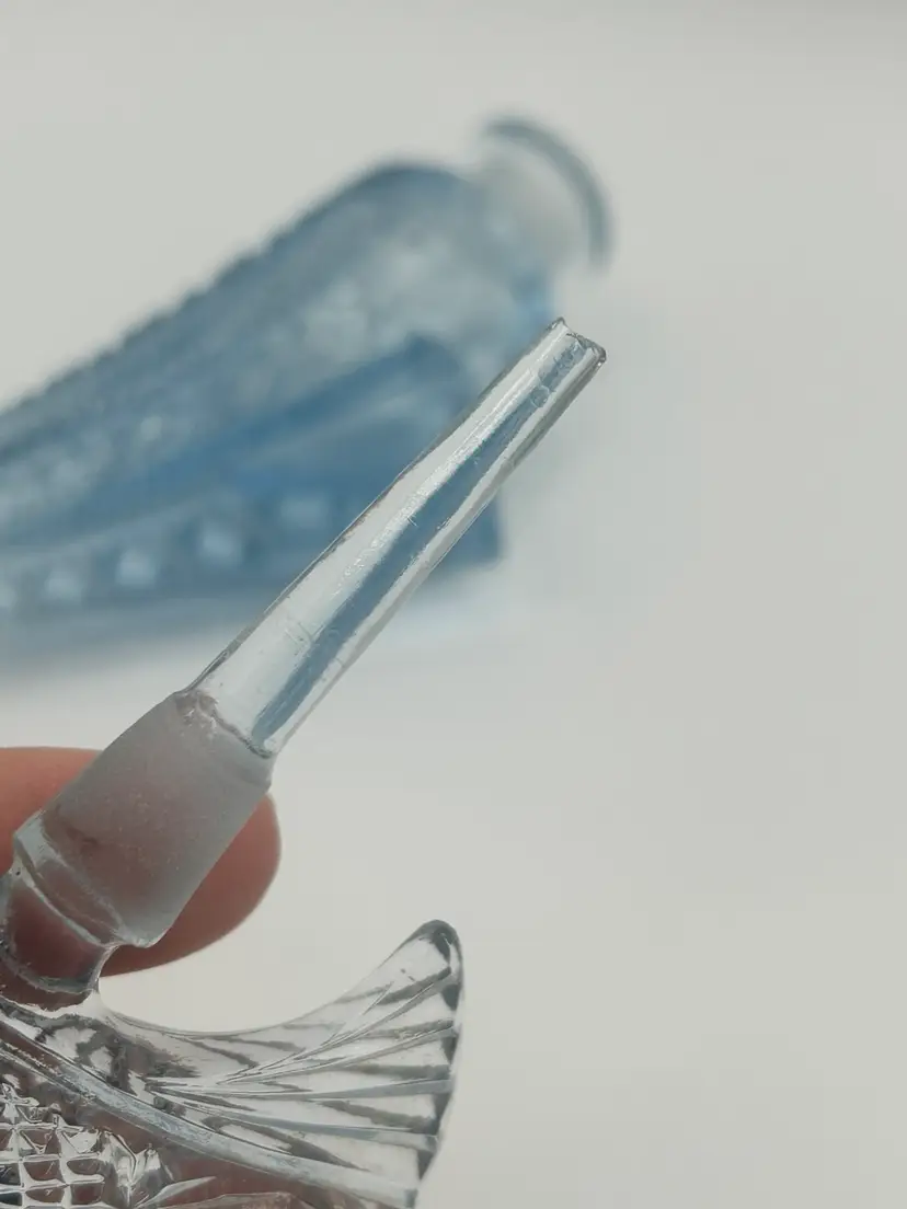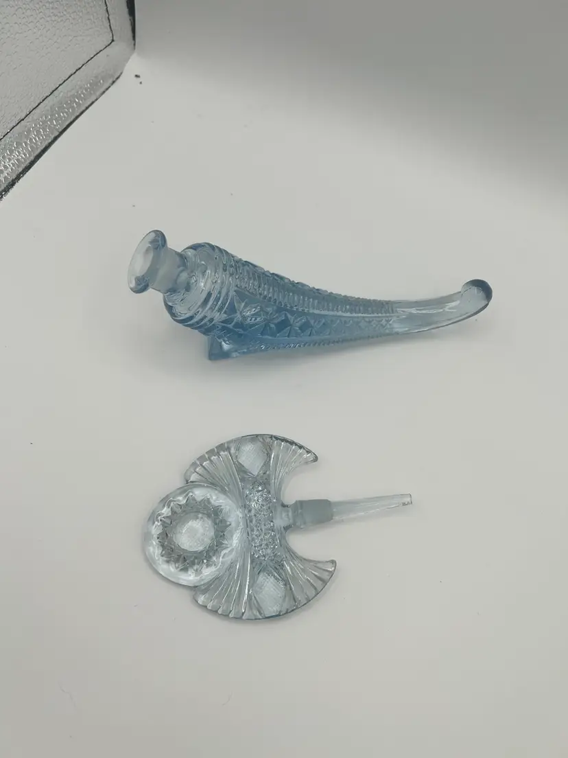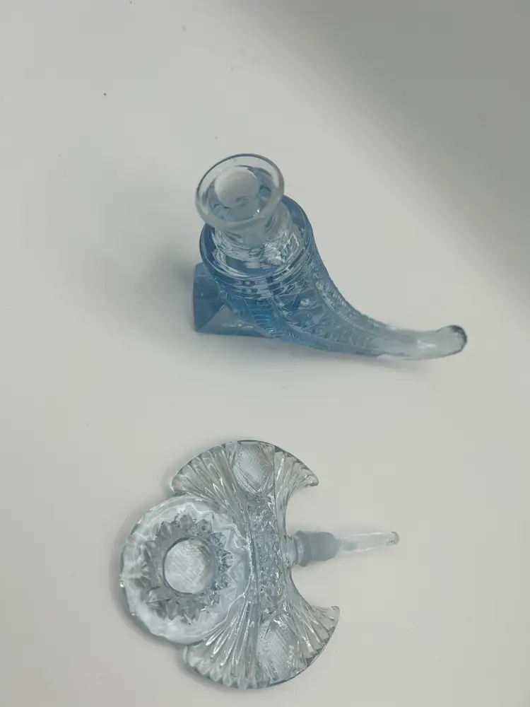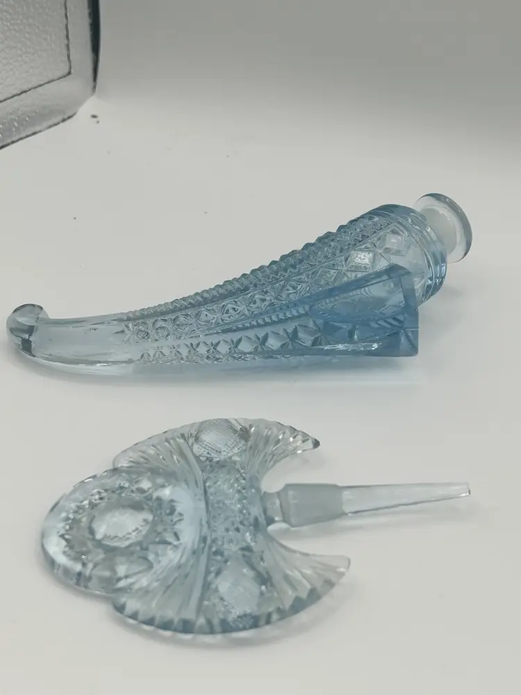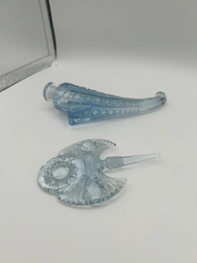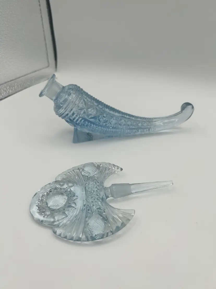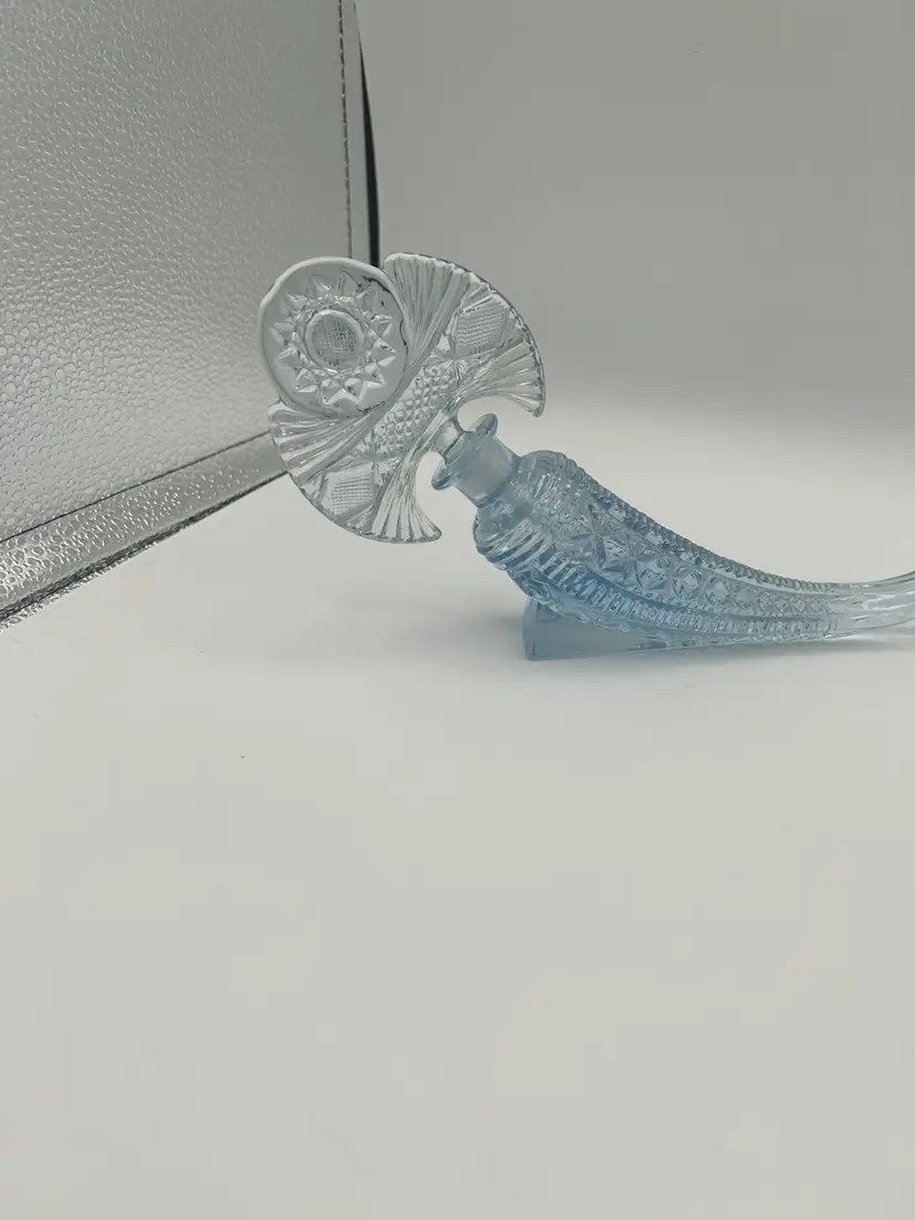 The 1930's Light Blue Cornucopia Pressed Glass Perfume Bottle with Fan Stopper is a unique collectible piece with a vintage charm. The unmarked brand adds to its allure, and the beautiful cornucopia design adds a touch of elegance. This unit includes one perfume bottle with a fan stopper, making it a special addition to any vanity or collection of decorative glassware. Perfect for those who appreciate classic and timeless pieces from the past.