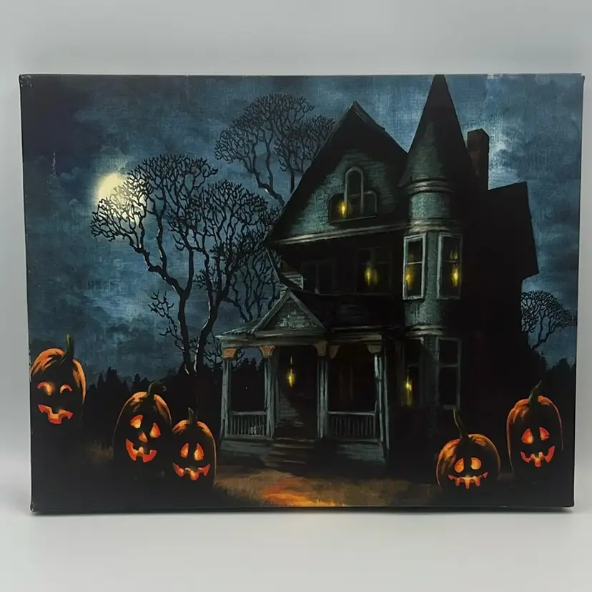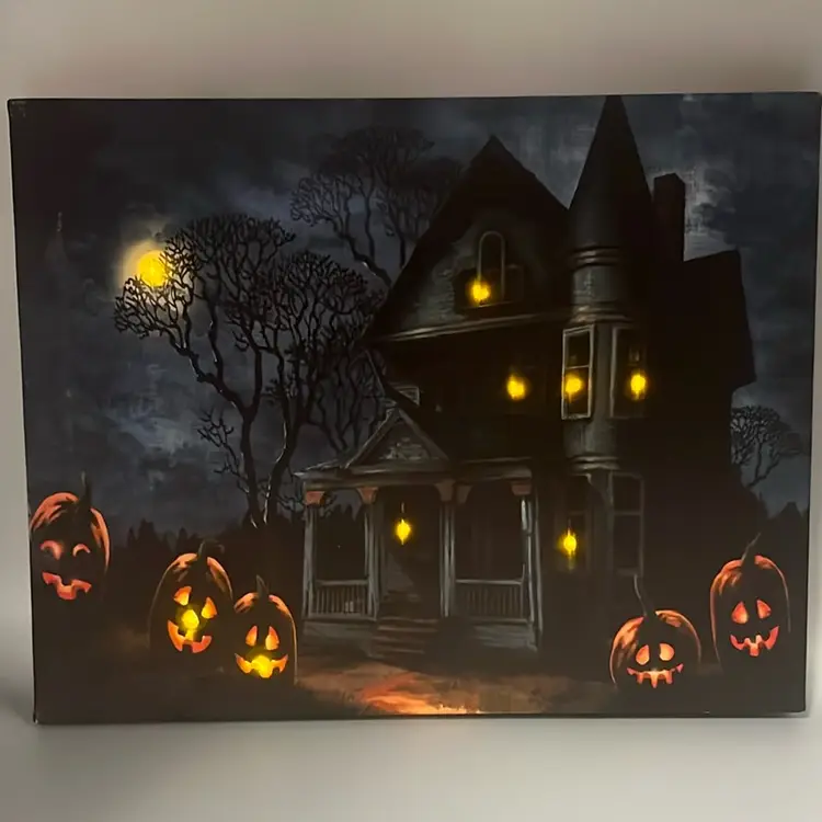 Modern print on canvas. Two AA batteries. Switch on bottom. Tested and working! Lights flicker in windows and pumpkins!
