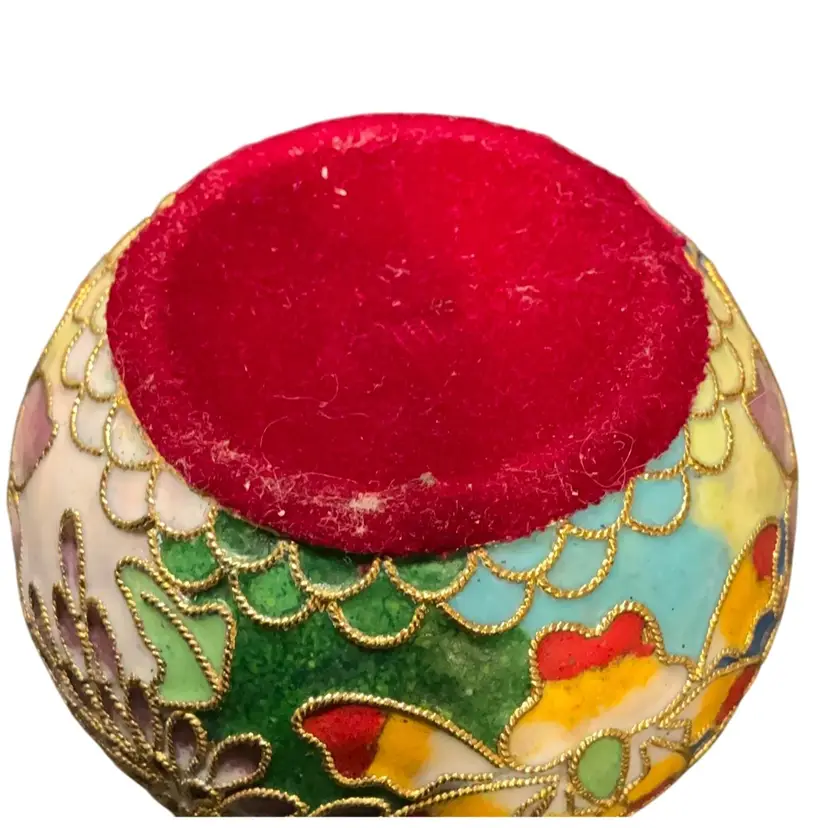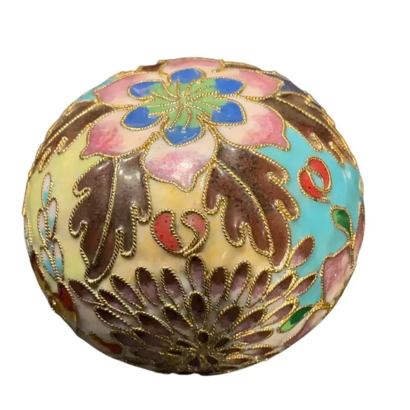 Cloisonné paperweight has a red felt bottom. Measures 3”x2.5”. Inside ball has jingle jangle.