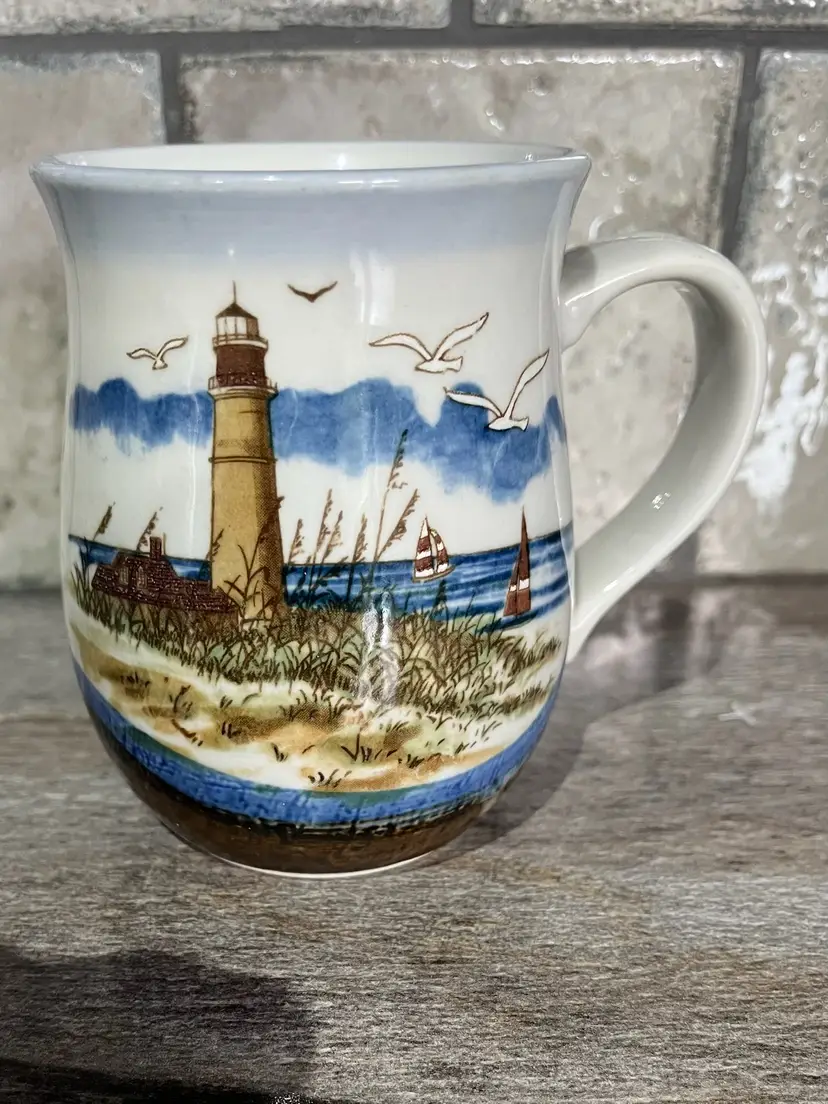 A Stoneware lighthouse coffee mug. Approximately 4 inches tall and wide. Excellent condition.