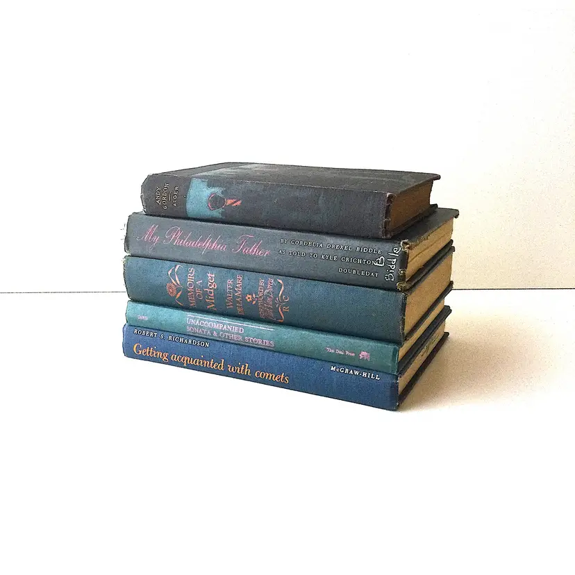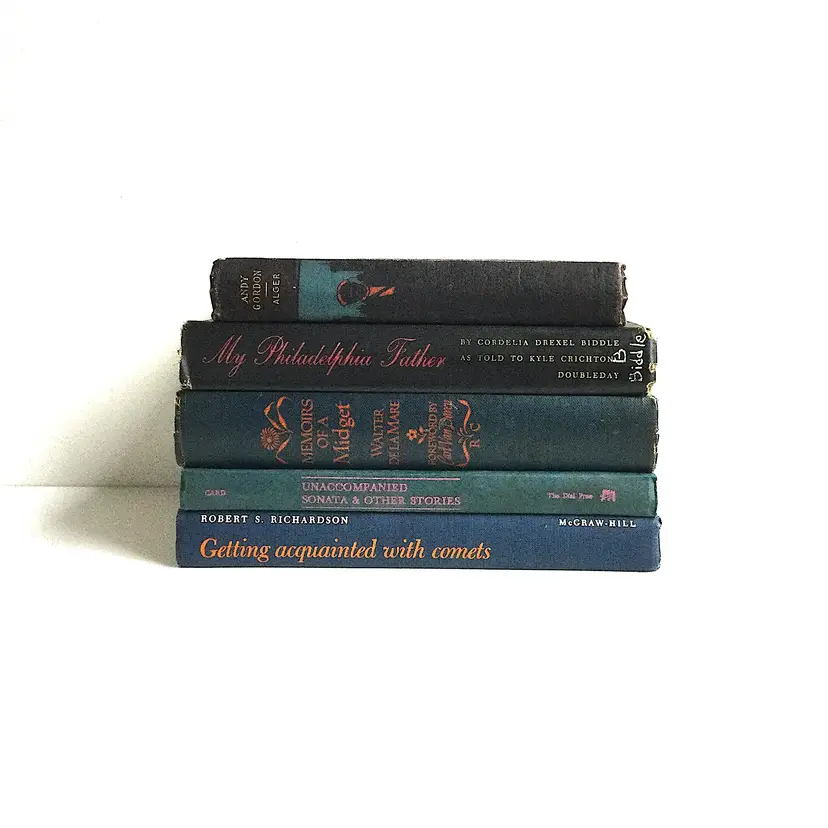 -stack measures approx. 5.5" high by 8.625" long by 5.75" wide -books date from the 1940s-80s with one potentially older (undated) book -fair/good vintage condition; books may be ex-library copies with stamps or markings, dents or dings -titles include: Getting Acquainted with Comets (Robert S. Richardson, 1967) Unaccompanied Sonata & Other Stories (Orson Scott Card, 1981) Memoirs of a Midget (Walter de la Mare, 1941) My Philadelphia Father (Cordelia Drexel Biddle, 1955) Andy Gordon (Horatio Alger, Jr., undated)