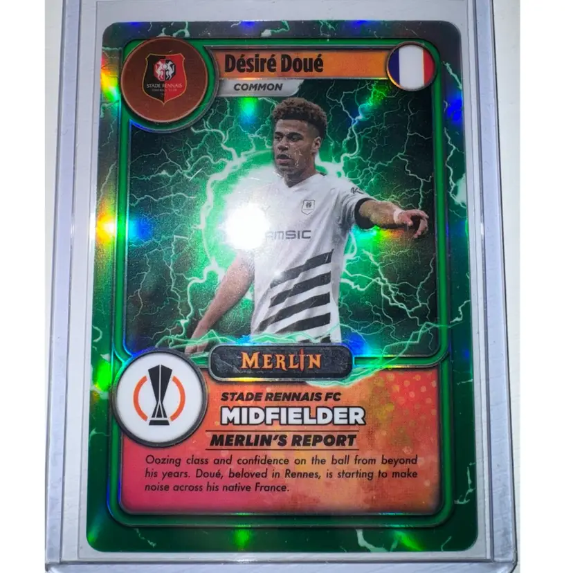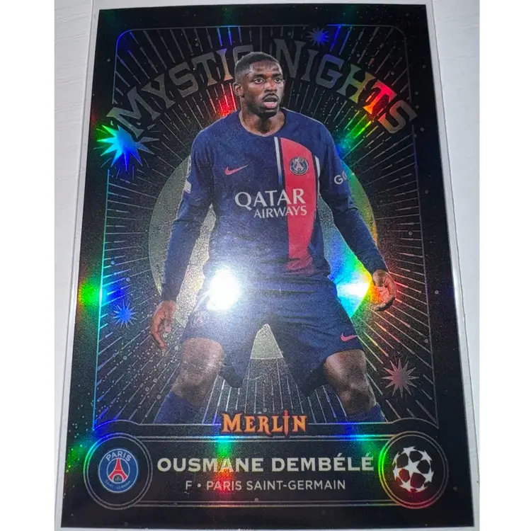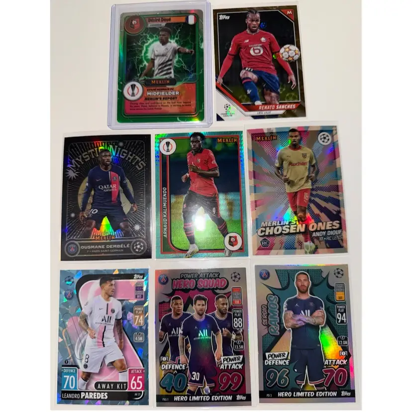 This 8 Card Lot Includes: Desire Doue 2023 Merlin Merlins Gamers Renato Sanches 2021 Topps UCL Gold Starball /50 Ousmane Dembele 2023 Merlin Mystic Nights Arnaud Kalimuendo 2023 Merlin Aqua Prism Andy Diouf 2023 Merlin Merlins Chosen Ones Leandro Paredes 2021 Match Attax Away Kit Messi, Mbappe, Neymar 2021 Match Attax Hero Squad Sergio Ramos 2021 Match Attax Hero