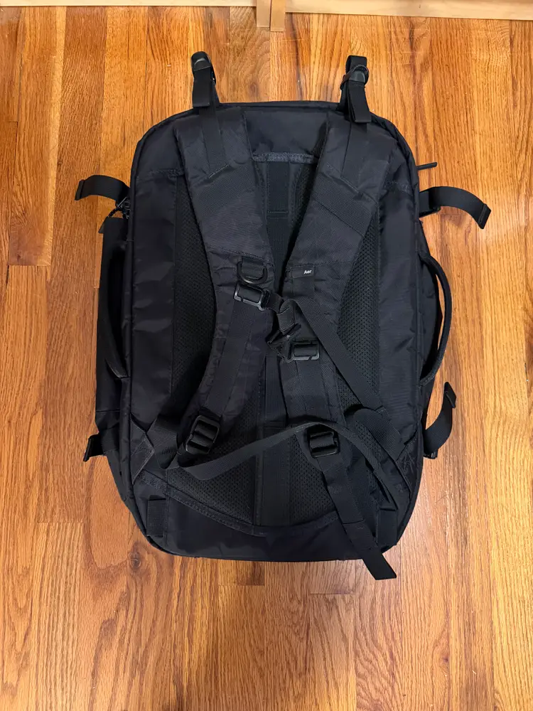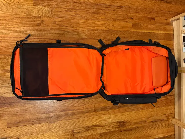 A beautifully built, sumptuous black backpack with bright orange interior. I've used the bag a couple of times for two-week travel in Europe, but have since collected several light bags that have supplanted its use and exhausted the space reserved for such gear. As far as I can tell, this version differs little from the V3 model that currently sells for $279.