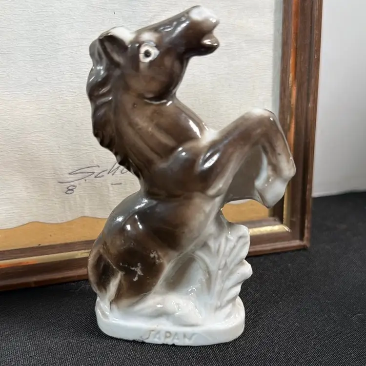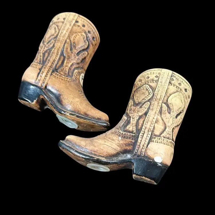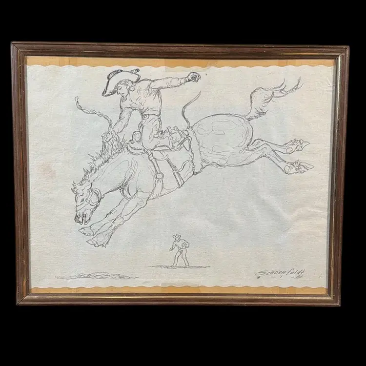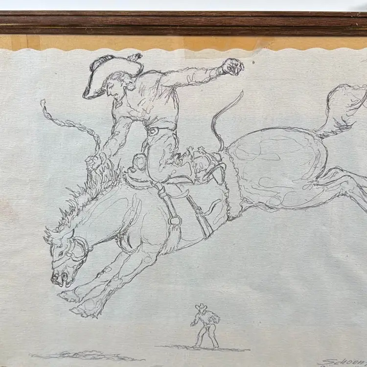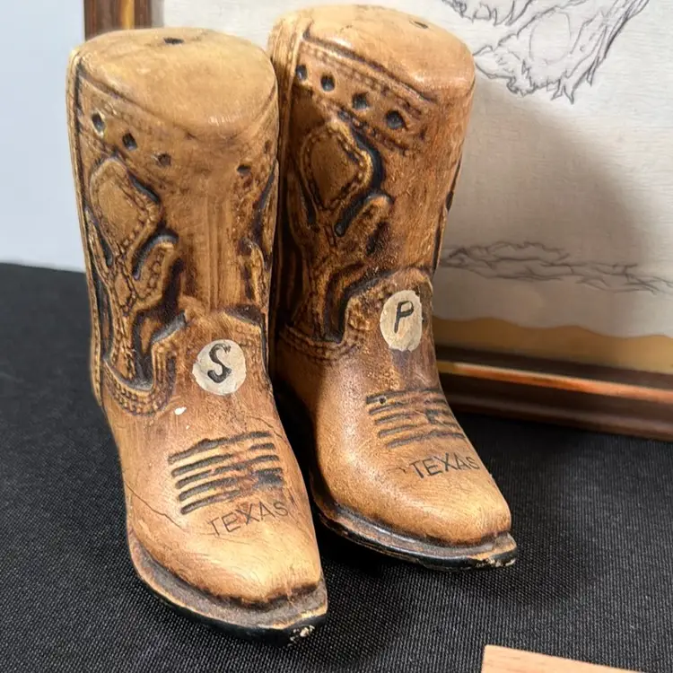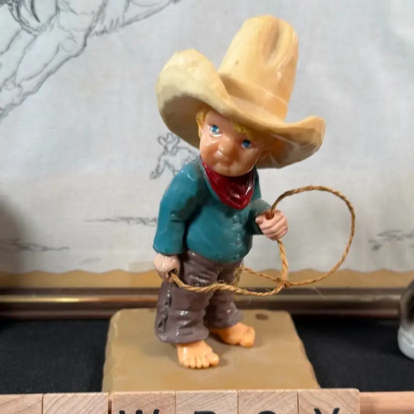 The picture is 14” x 11” and hand drawn on a napkin The lil cowboy is a vintage plastic Wilton cake topper The horse is from Japan The boots are souvenir S&P shakers. One has a small glaze chip Scrabble tiles