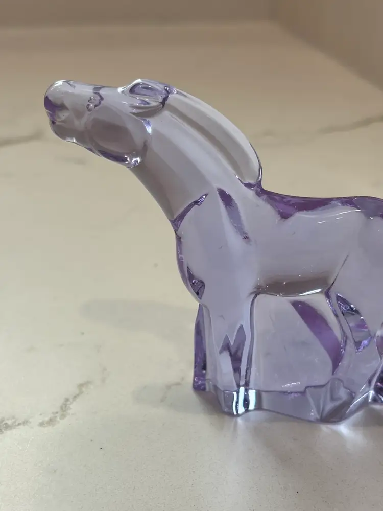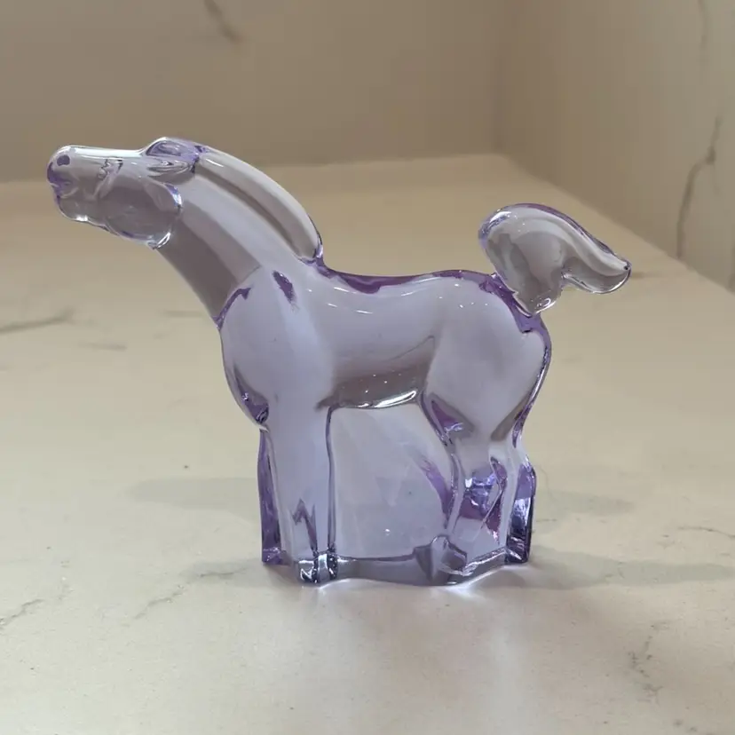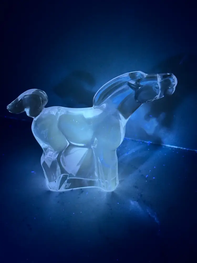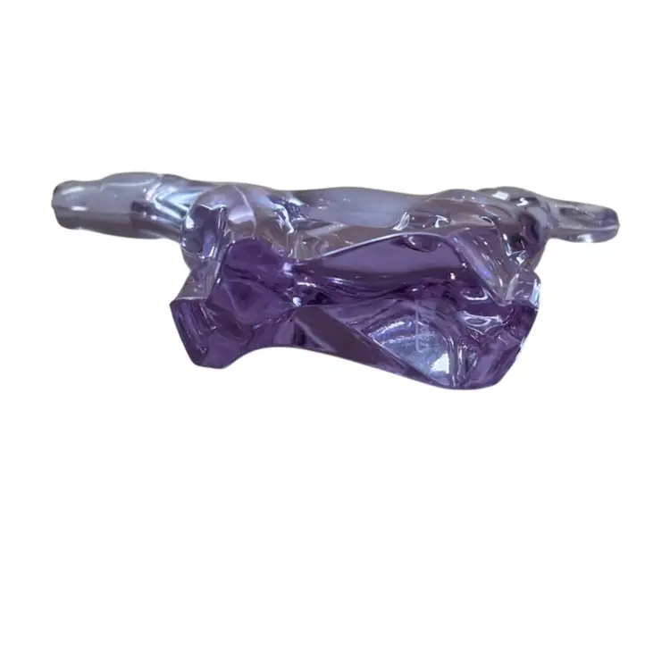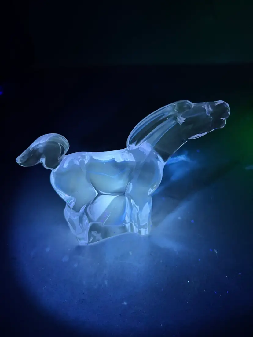 Lilac /lavender changes color to white under uv light. Might change to other colors under different lights with different wavelengths. 3.5” tall x 4.5” long. No chips cracks or repairs. Signed Moser.