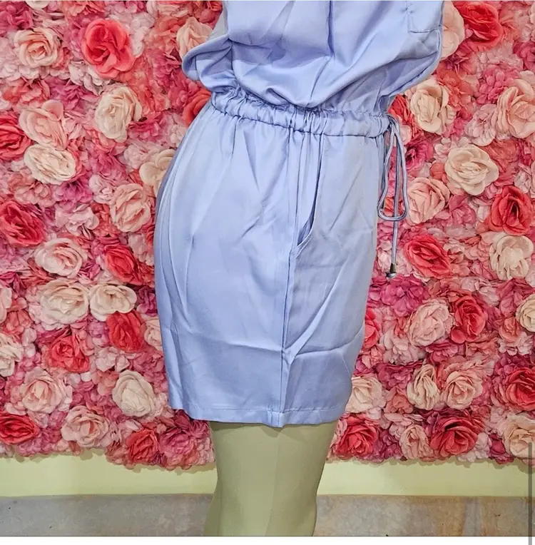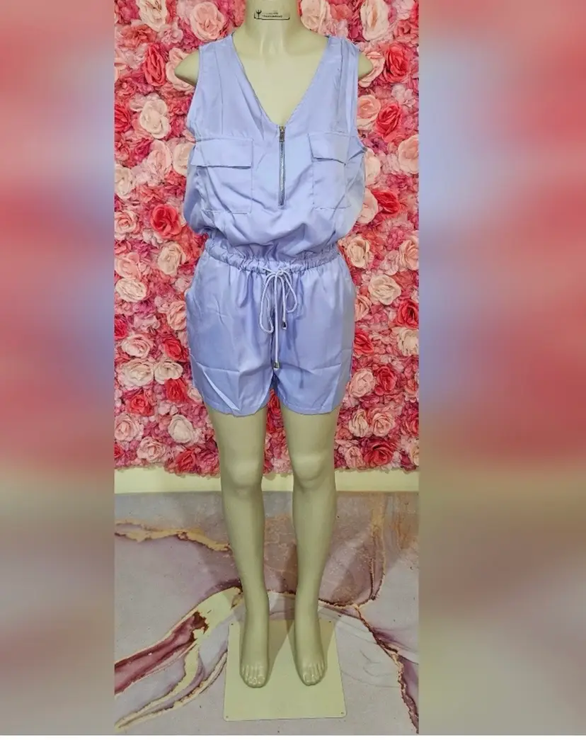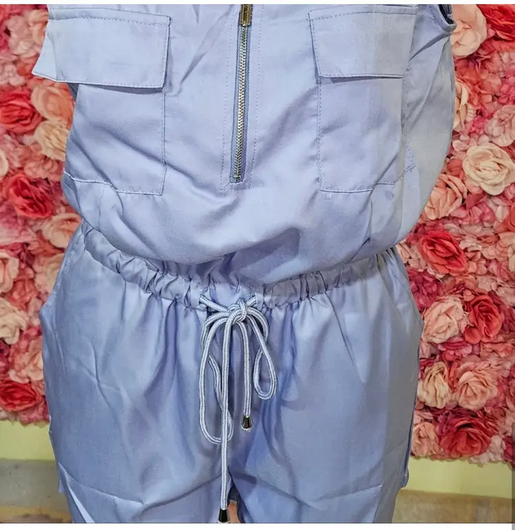 Step into laid-back style with this sleeveless lilac romper, designed for comfort and ease. Its front zipper and dual chest pockets add a functional edge, while the adjustable drawstring waist lets you tailor the fit to your liking for a flattering silhouette.