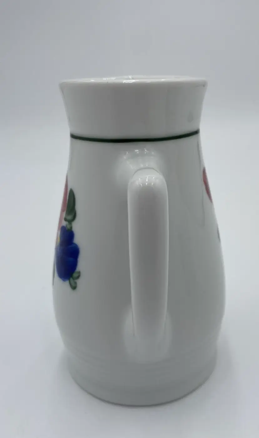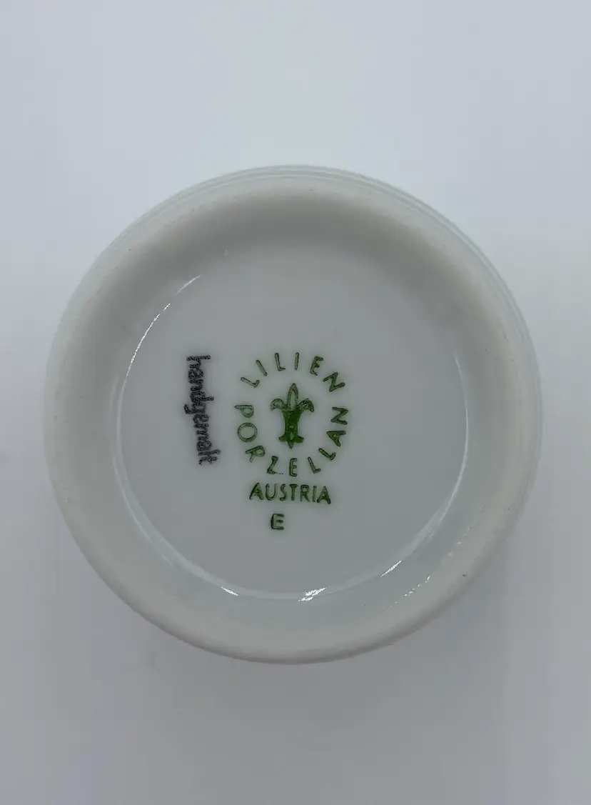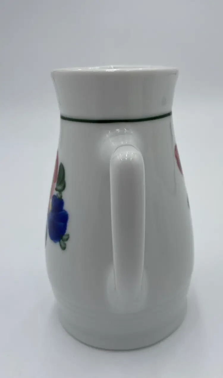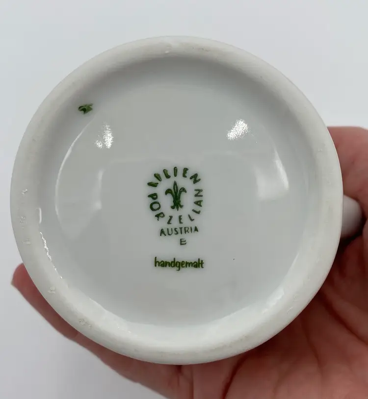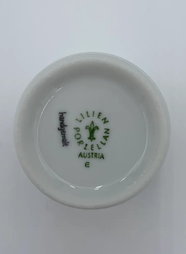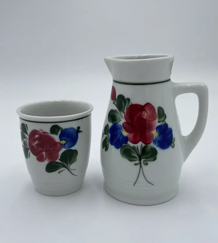 This vintage Lilien Porzellan (Austria) Mini-Pitcher and Cup bedside set consists of beautiful hand-painted pieces with the colorful "Alpenflora" design. Made in 1992 in Wilhelmsburg, Lower Austria, this set includes a mini-pitcher and a drinking cup. The pitcher has a capacity of 12 ounces, perfect for placing on your nightstand along with its matching cup. Lilien Porzellan is known for their restaurant-ware, gorgeous porcelain that is built to withstand daily wear and tear. This pattern/style was made predominantly in the 1990s and would have graced the tables of high-end hotels and restaurants. The Alpenflora pattern features traditional Austrian Folk style and craftsmanship. This would be a perfect set for your nightstand! It could also be used on your dining table.