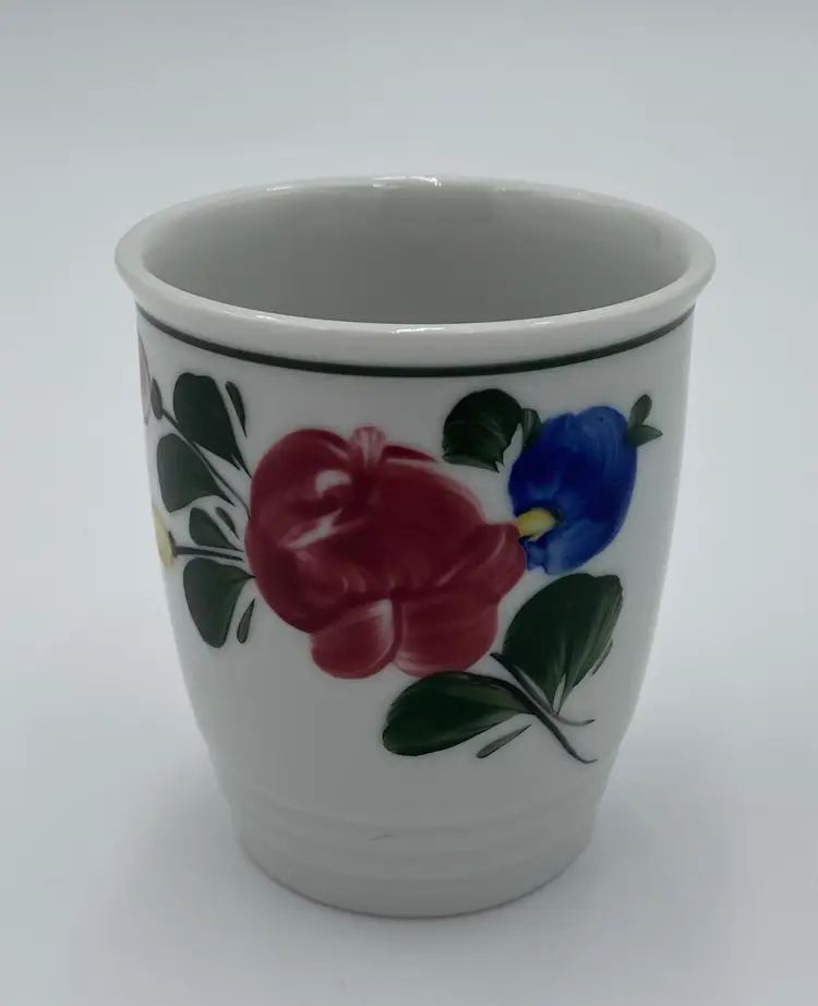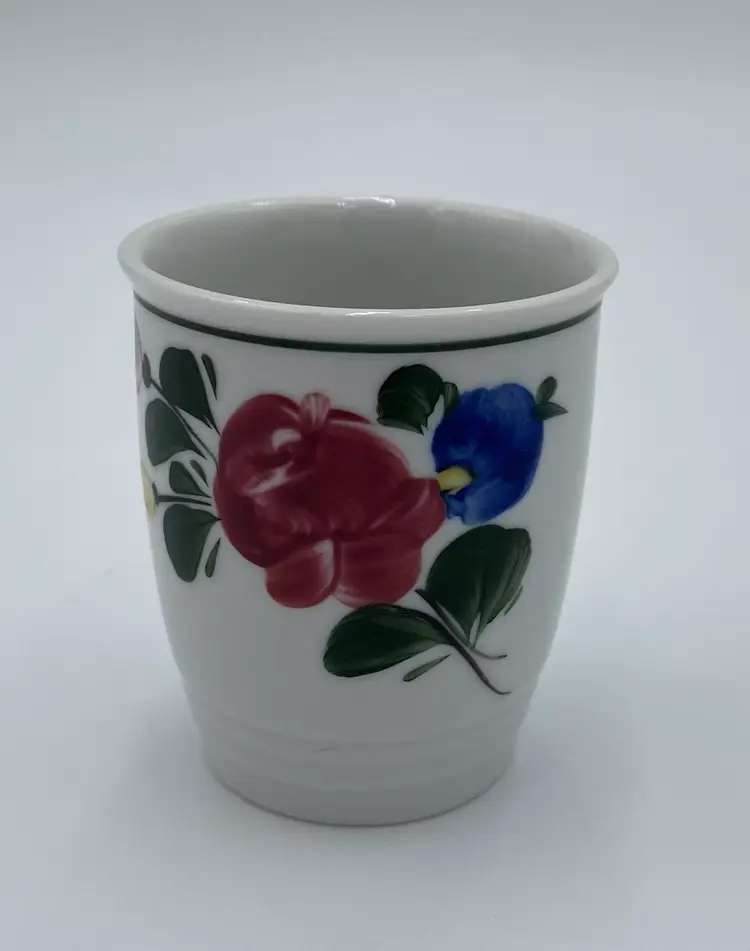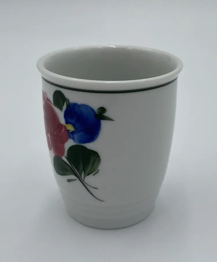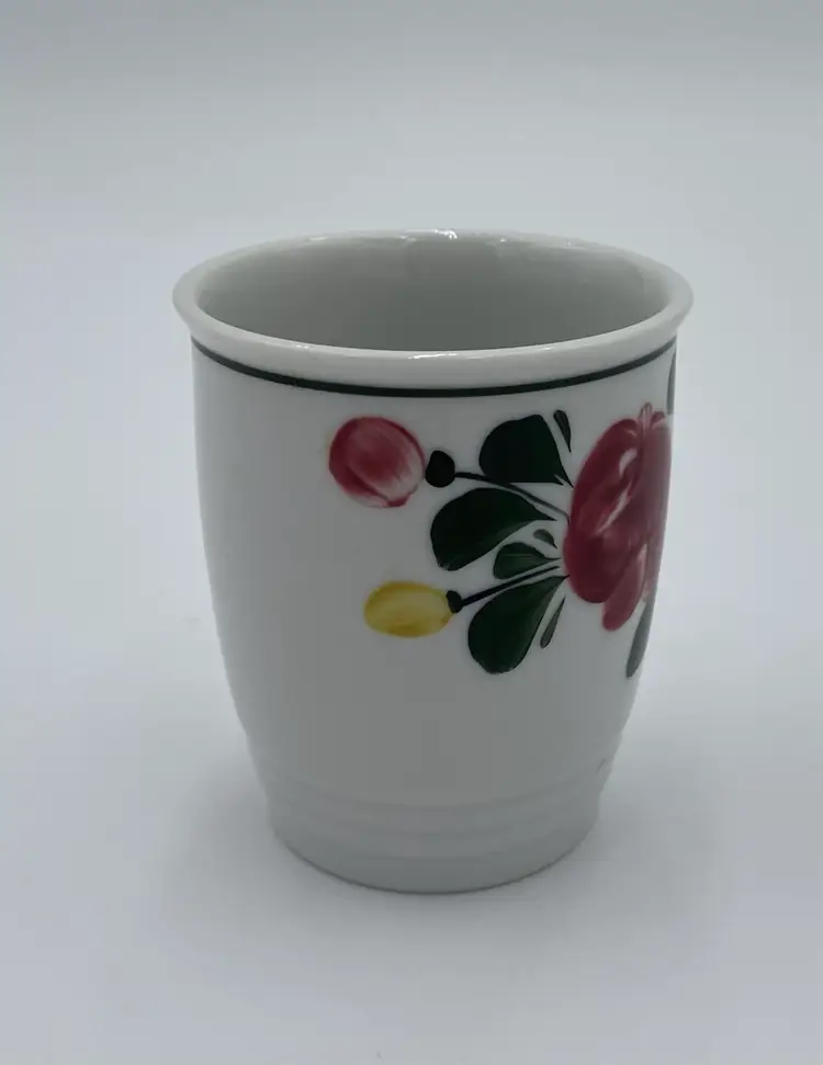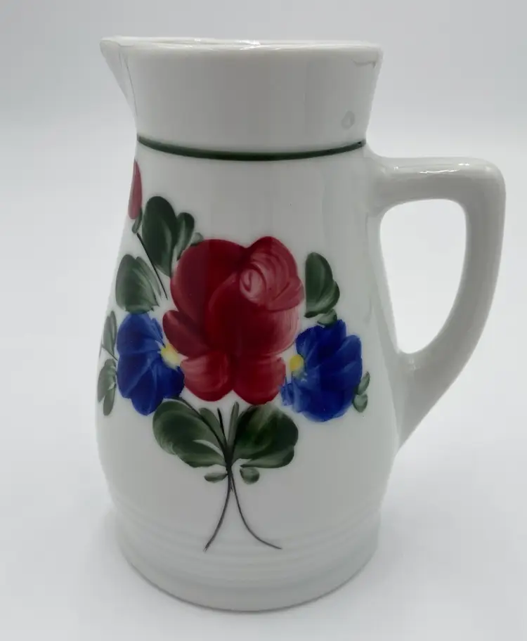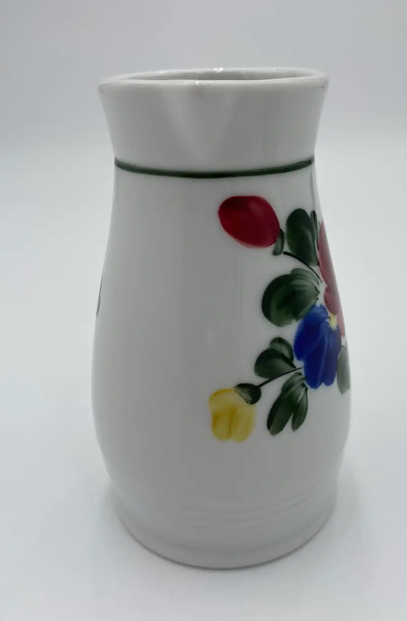 This vintage Lilien Porzellan (Austria) Mini-Pitcher and Cup bedside set consists of beautiful hand-painted pieces with the colorful "Alpenflora" design. Made in 1992 in Wilhelmsburg, Lower Austria, this set includes a mini-pitcher and a drinking cup. The pitcher has a capacity of 12 ounces, perfect for placing on your nightstand along with its matching cup. Lilien Porzellan is known for their restaurant-ware, gorgeous porcelain that is built to withstand daily wear and tear. This pattern/style was made predominantly in the 1990s and would have graced the tables of high-end hotels and restaurants. The Alpenflora pattern features traditional Austrian Folk style and craftsmanship. This would be a perfect set for your nightstand! It could also be used on your dining table.