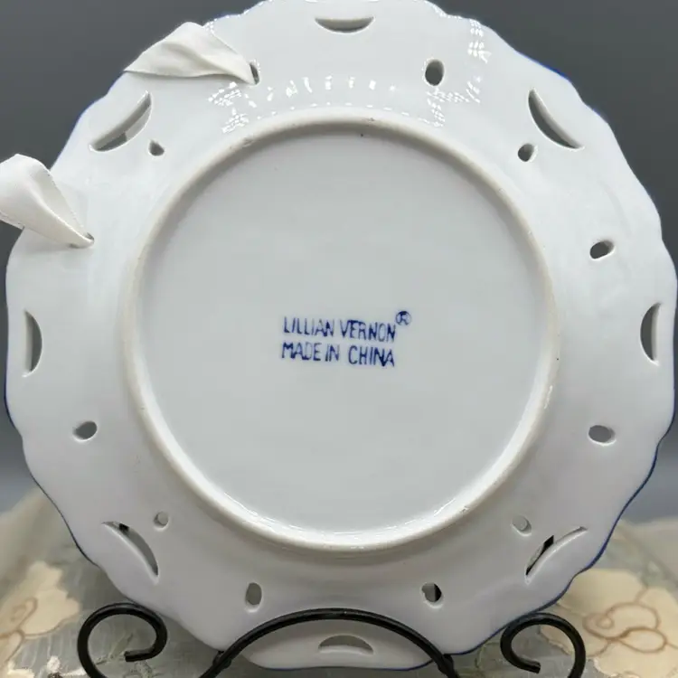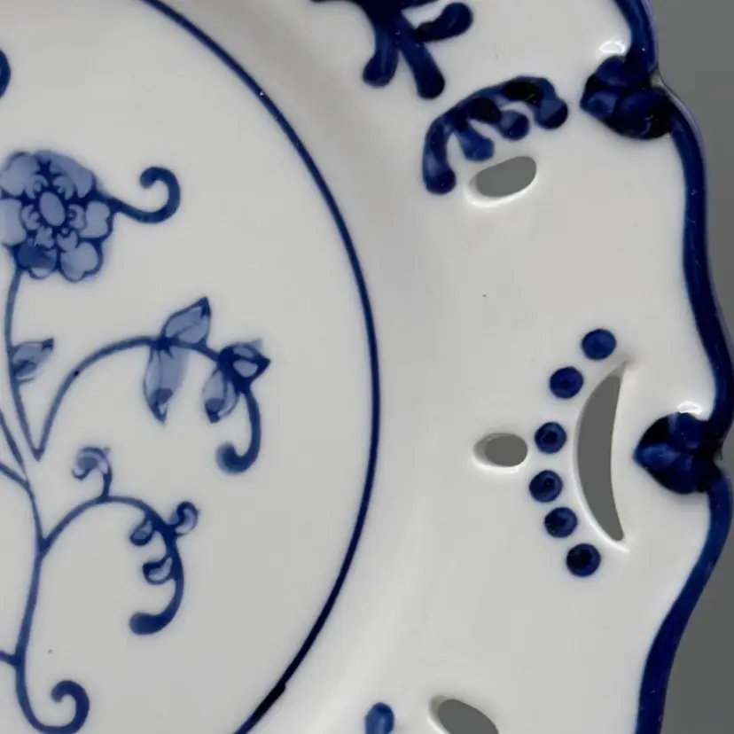 A vibrant cobalt blue floral spray is featured at the center. The design is applied using a high-quality transferware technique on fine white porcelain, the plate is decorated with a vibrant cobalt blue floral spray at its center, reminiscent of the traditional "Blue Onion" pattern. The standout feature is its reticulated (pierced) border, which showcases intricate openwork and a delicate scalloped edge trimmed in deep blue. Excellent conditions no chips, cracks or repairs.