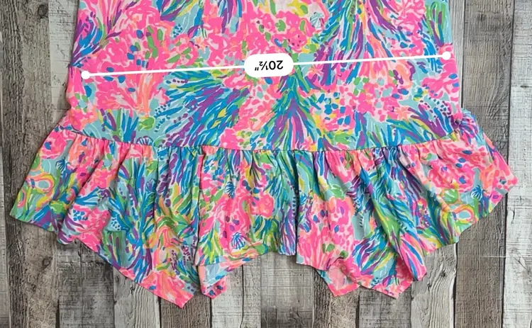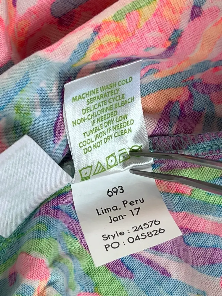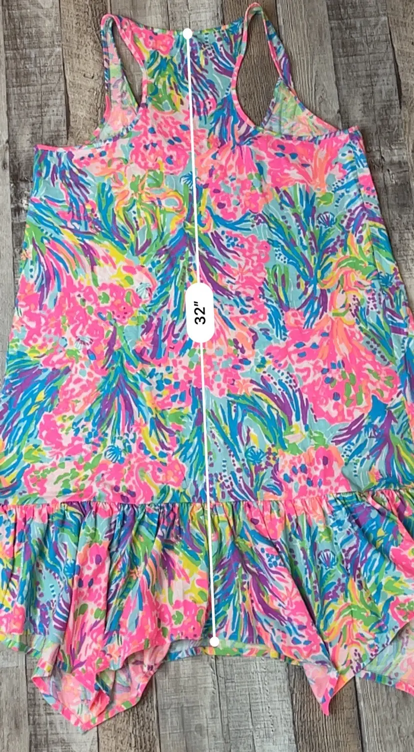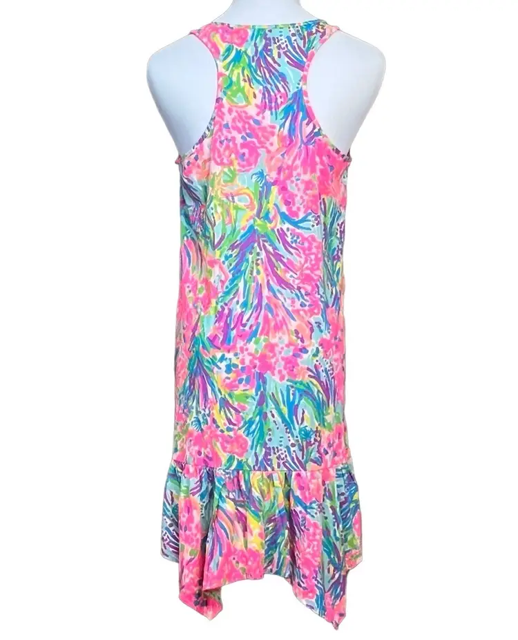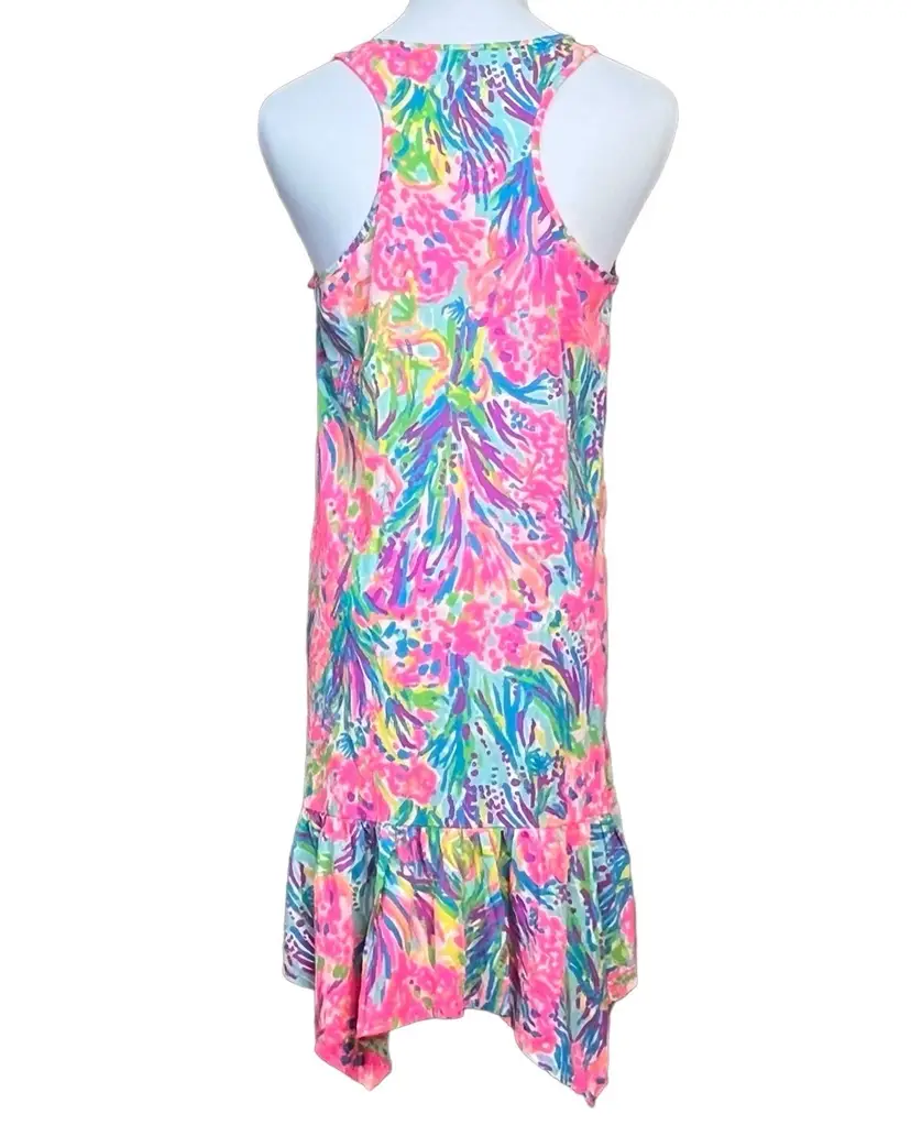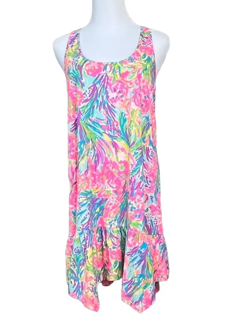 Lilly Pulitzer 24576 Hampton Fan Sea Pants Pink Coverup Dress sz SMALL. Attractive Asymmetrical hem line with ruffled bottom. 100% Pima Jersey Cotton. Machine washable delicate cold. Close to new condition. No known rips, tears, holes, stains or defects. Unaltered. From the 2017 collection. Retails $118. Cottagecore, Colorful, Designer, Beach, Coastal, Swimwear.