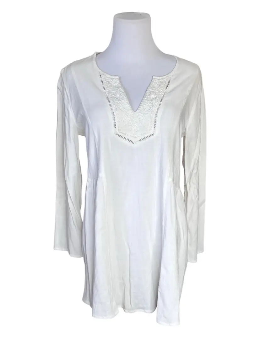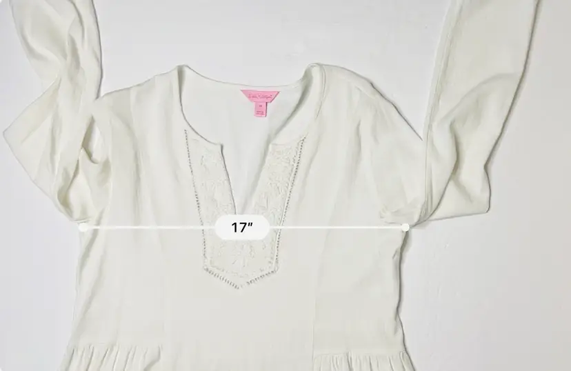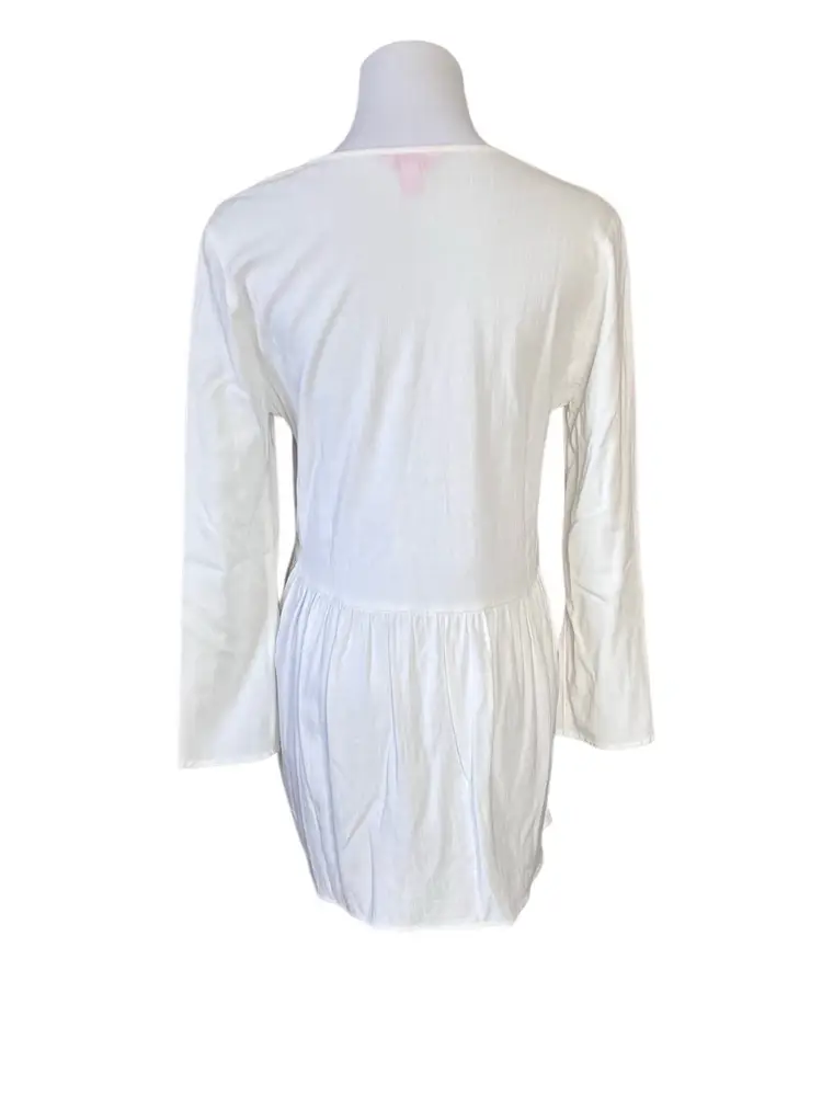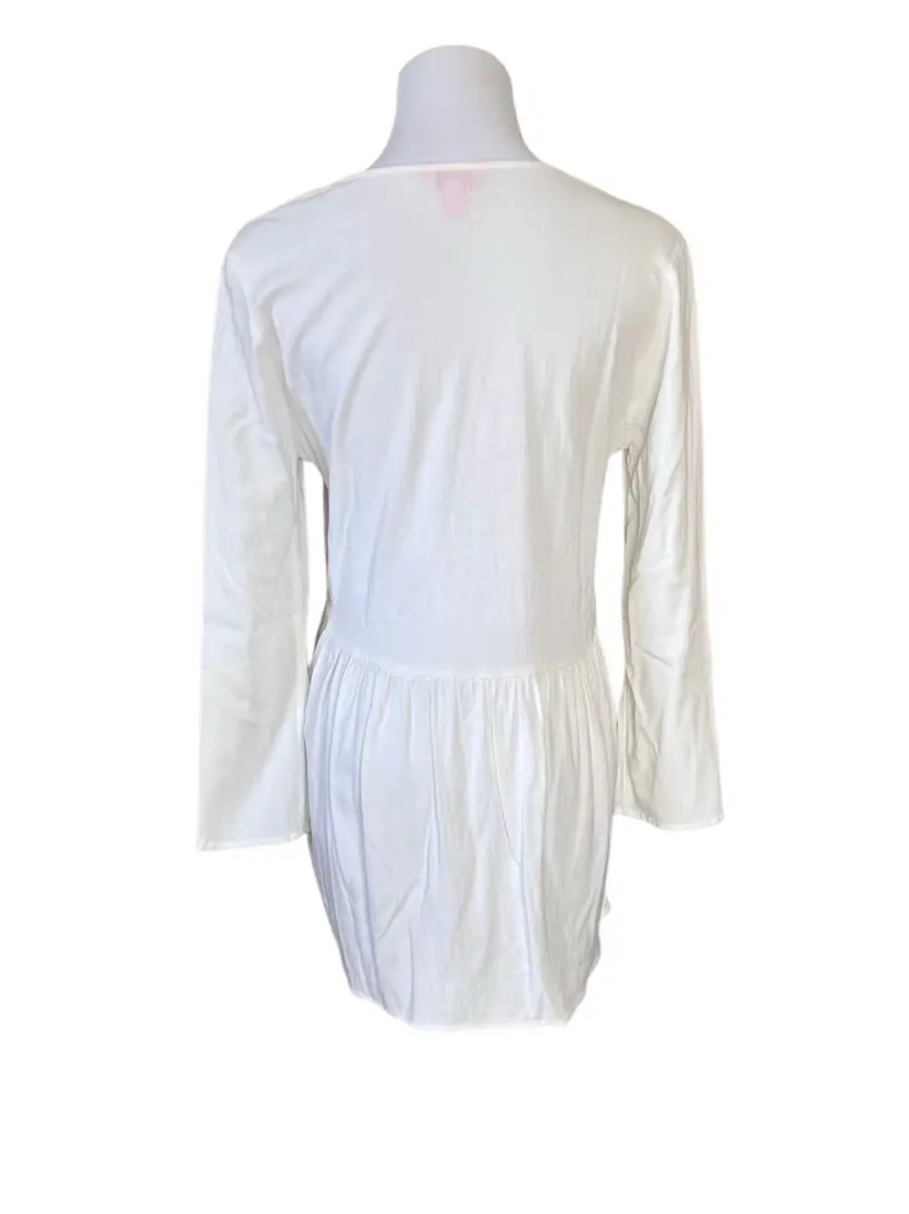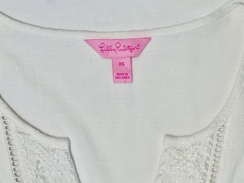 Lilly Pulitzer 30393 Lyndsea Tunic Blouse Resort White sz XS Stretch. Item in excellent gently used condition. Rayon Spandex blend. No known rips, tears, holes, stains or defects. Retails $128. Resort, Cruise, Vacation.